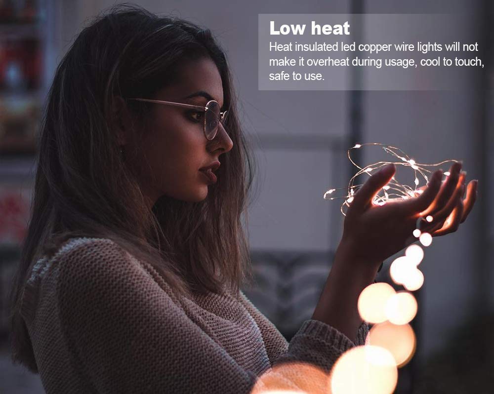 Widely used with these string lights ?These lights look like many beautiful fire flies, and the copper wire is extra flexible, You can decorate teenager or girls 's rooms to enjoy ambience of relaxing, decorate your wedding to memorize your important and romantic moment, decorate it in restaurant or shop, create welcome feeling, customers will be attracted by the twinkle String Lights,walk into shop or restaurant, stay longer, enjoy their commodity or food and love your shop or restaurant. ?You can also decorate your party to feel more joyful, decorate holidays and Christmas to enjoy happy times.With extra flexible copper wire, you can put these led fariy lights in the glass jar,vase, or you can easily bend and shape it around wreaths, trees, flowers, and almost everything else. Not Over Heat: ?Low current ensures that the copper wire will not overheat. You and your family can fully enjoy the lights without worrying about being hurt. Waterproof Except Battery Box. ?Only the copper wire parts are waterproof and can be soaked into water; battery case is not waterproof and better be kept away from water., suitable for both indoor and outdoor lighting decorations. NOTE: ?The battery box is NOT waterproof.