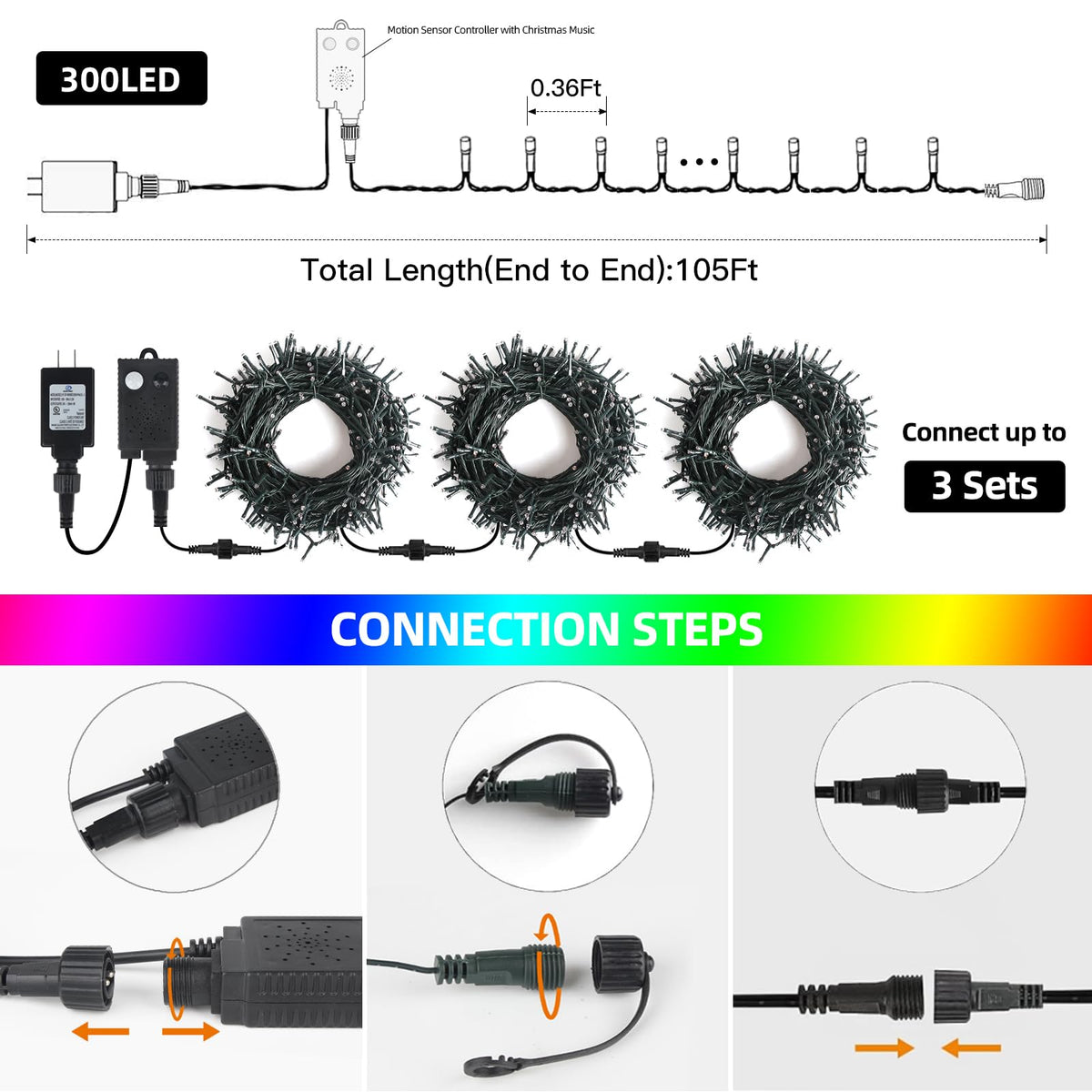 Music Motion Sensor Christmas String Lights 105Ft 300 Led,Multicolour Christmas Tree Lights,End To End Plug In 6 Modes Decorativ