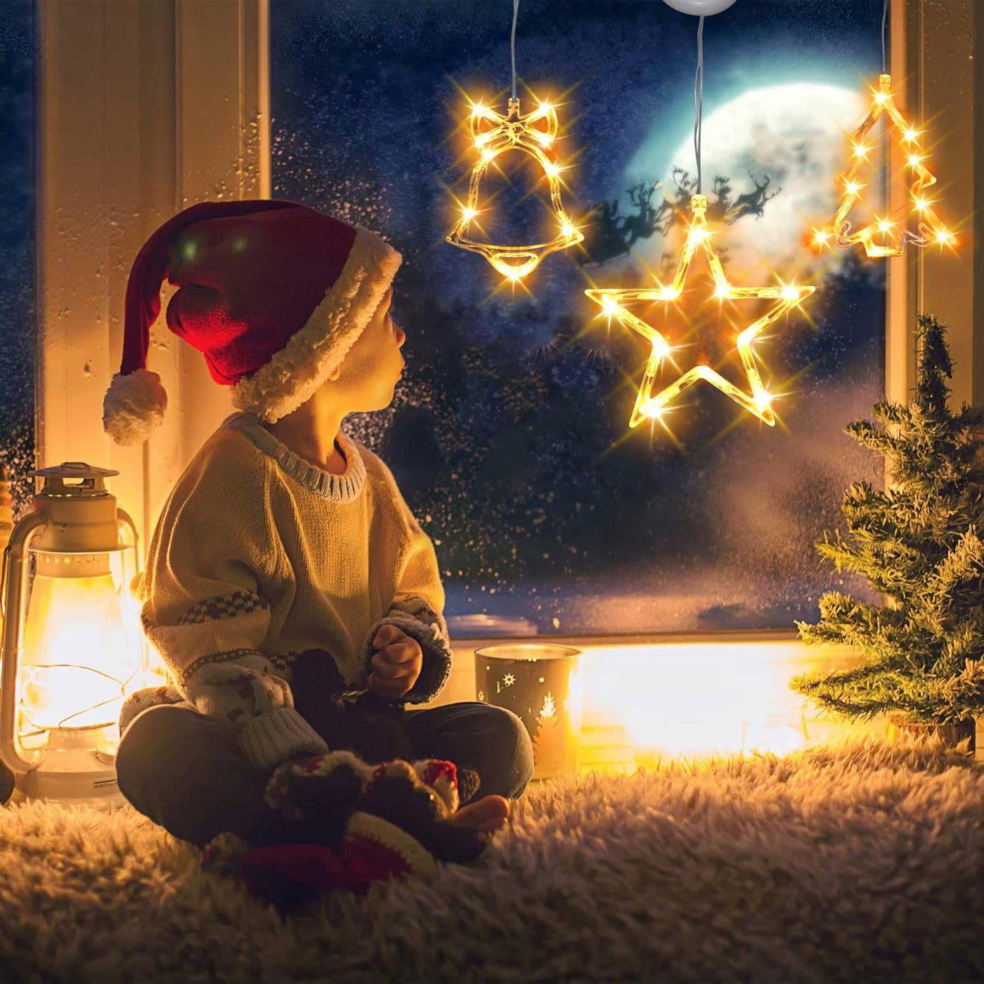 Muyun Christmas Window Decorations,3Pcs Christmas Window Lights Battery Powered Star&Jingle Bell&Xmas Tree Hanging Christmas Lights With Suction Cup Hook,Timer For New Year,Home,Party(Warm White