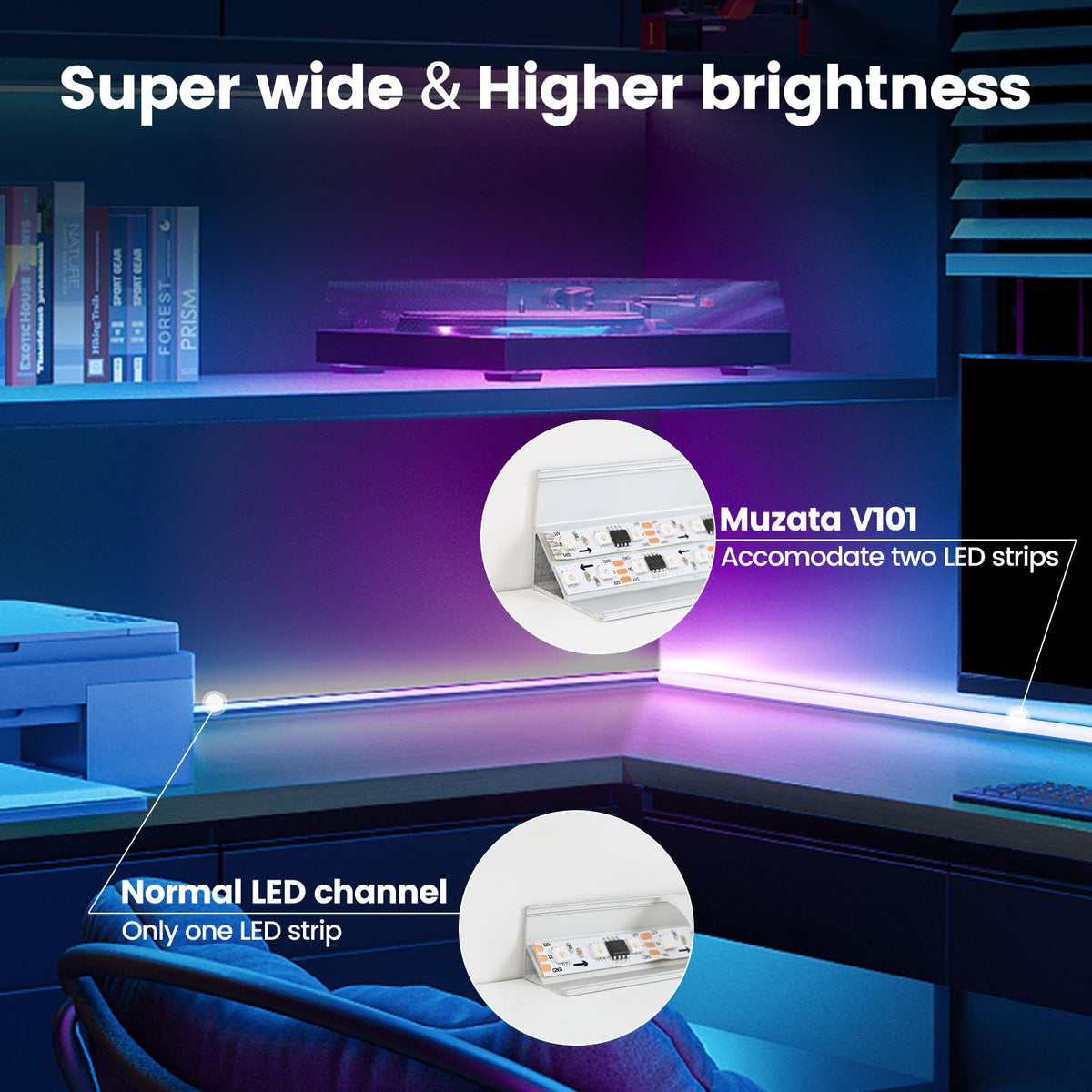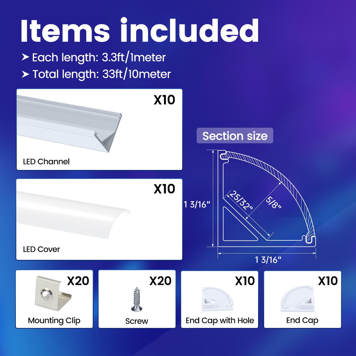 PACKAGE INCLUDE: 10PCS V shape LED Aluminum Channel and matching milky white lens, each segment is 1M (3.3FT), the total is 10M(33FT), 20PCS end caps, 20PCS mounting clips, 20PCS screws. You could search for Muzata 2M LV1 to purchase the 2M (6.6'') Muzata LED channels for a longer project.