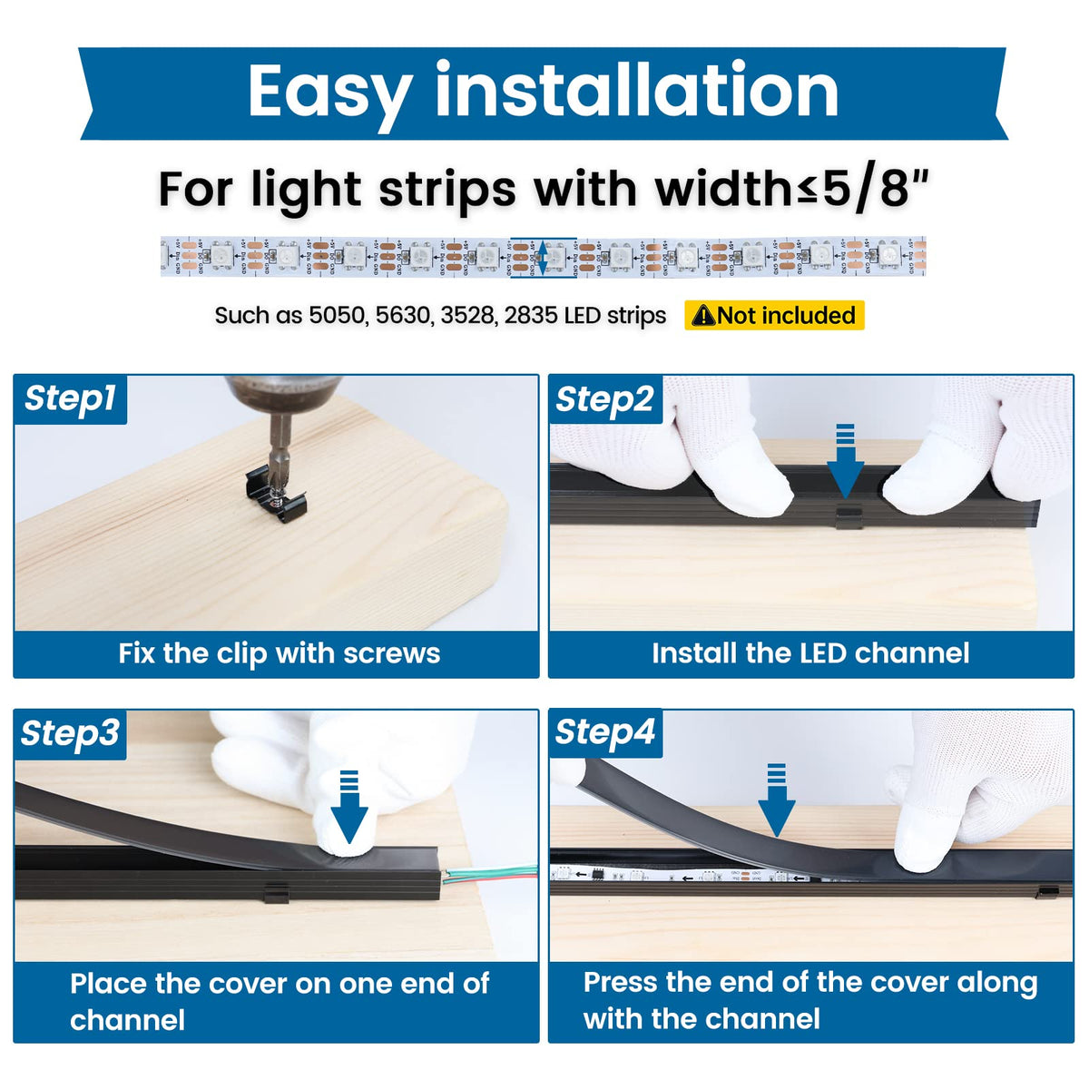 Q: What installation options are available for the LED channel?A: The Muzata LED channel offers two simple installation methods: you can either use the included mounting clips for a secure fit or opt for double-sided adhesive tape for a more streamlined installation. This versatility makes it easy to incorporate into various settings.