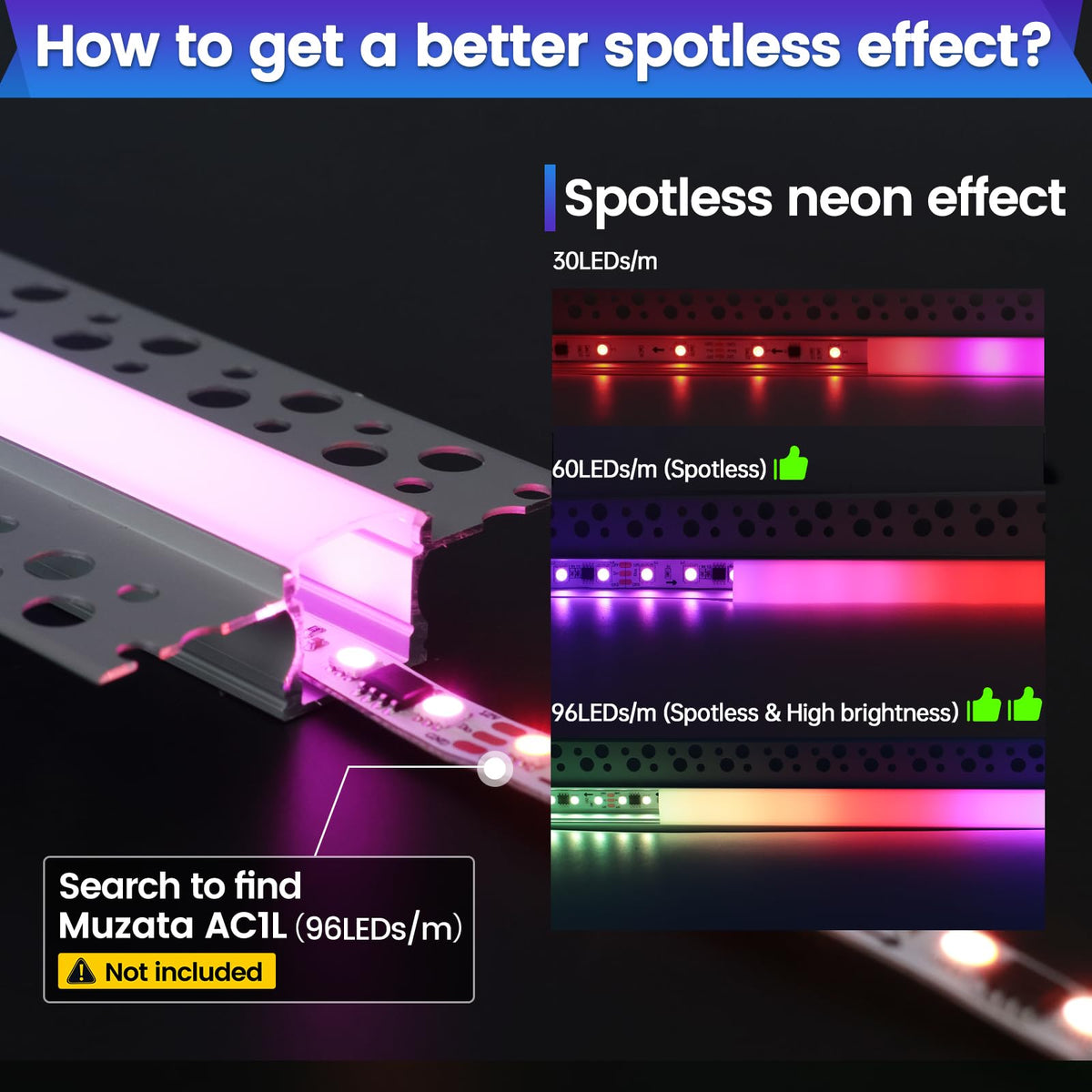 Q: What type of lighting effect can I achieve with the Muzata U117 LED channel?A: The Muzata U117 channel is designed to create a seamless lighting effect that enhances the aesthetic of your space, providing a sleek and modern look that minimizes visible LED dots and reduces glare.