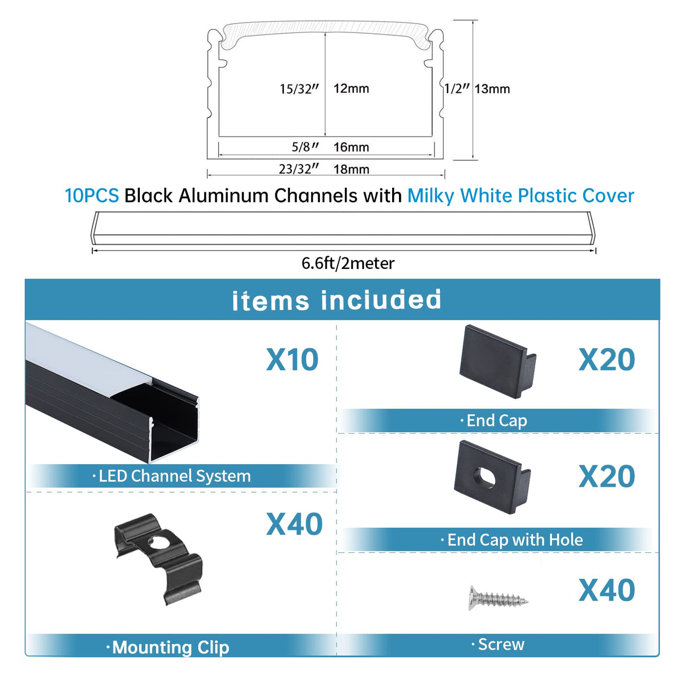 Q: What is included in the Muzata LED channel package?A: The package includes 10 black LED channels, 10 milky LED covers, 40 end caps, 40 mounting clips, and 40 screws, providing everything you need for installation.