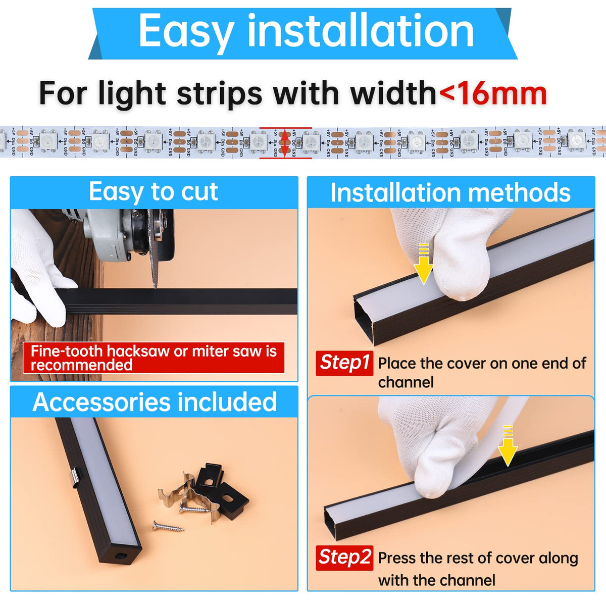 Q: How do I install the LED strips into the Muzata channel?A: The LED strips can be easily installed by snapping them into the channels. You can cut the channels to specific lengths using a fine-tooth hacksaw or miter saw.