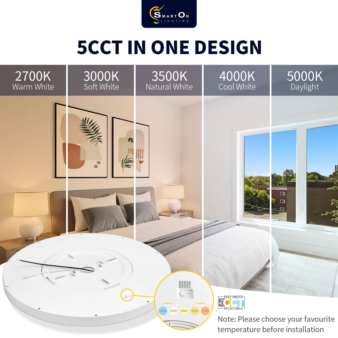 Q: How do I change the color temperature on this ceiling light?A: You can change the color temperature by using the CCT switch located on the back of the light fixture. It offers five options: twenty-seven hundred Kelvin soft white, three thousand Kelvin warm white, thirty-five hundred Kelvin neutral white, forty hundred Kelvin cool white, and five thousand Kelvin daylight.
