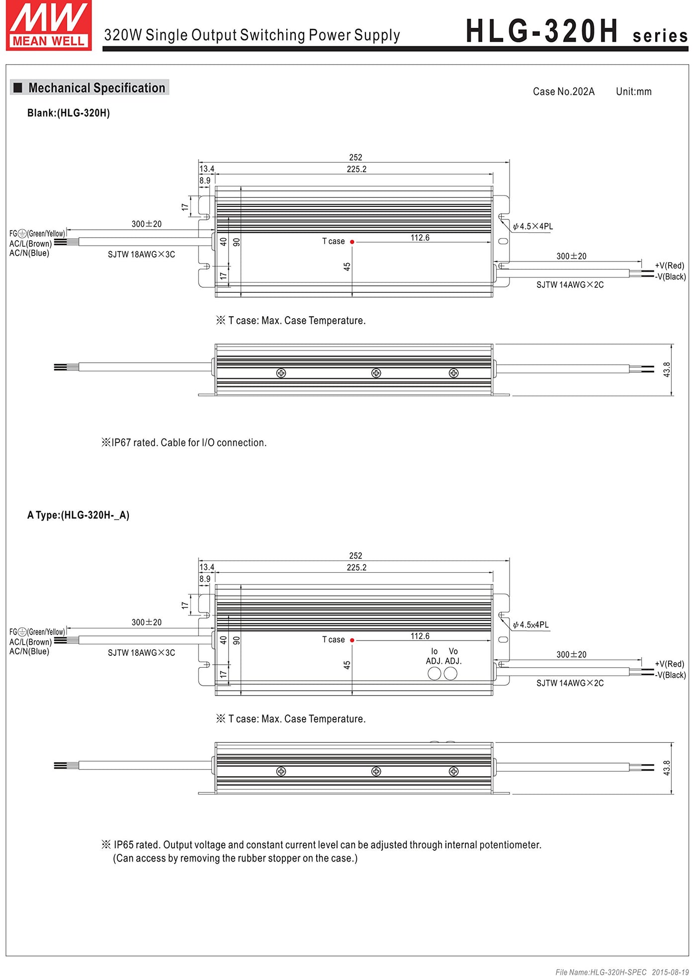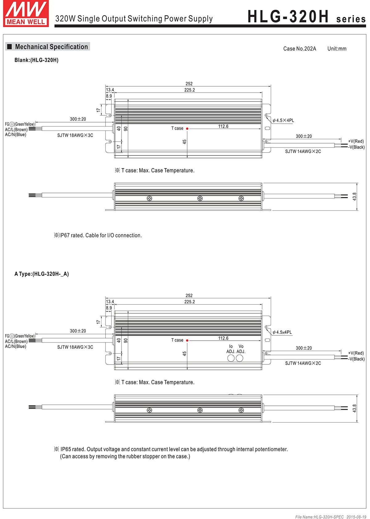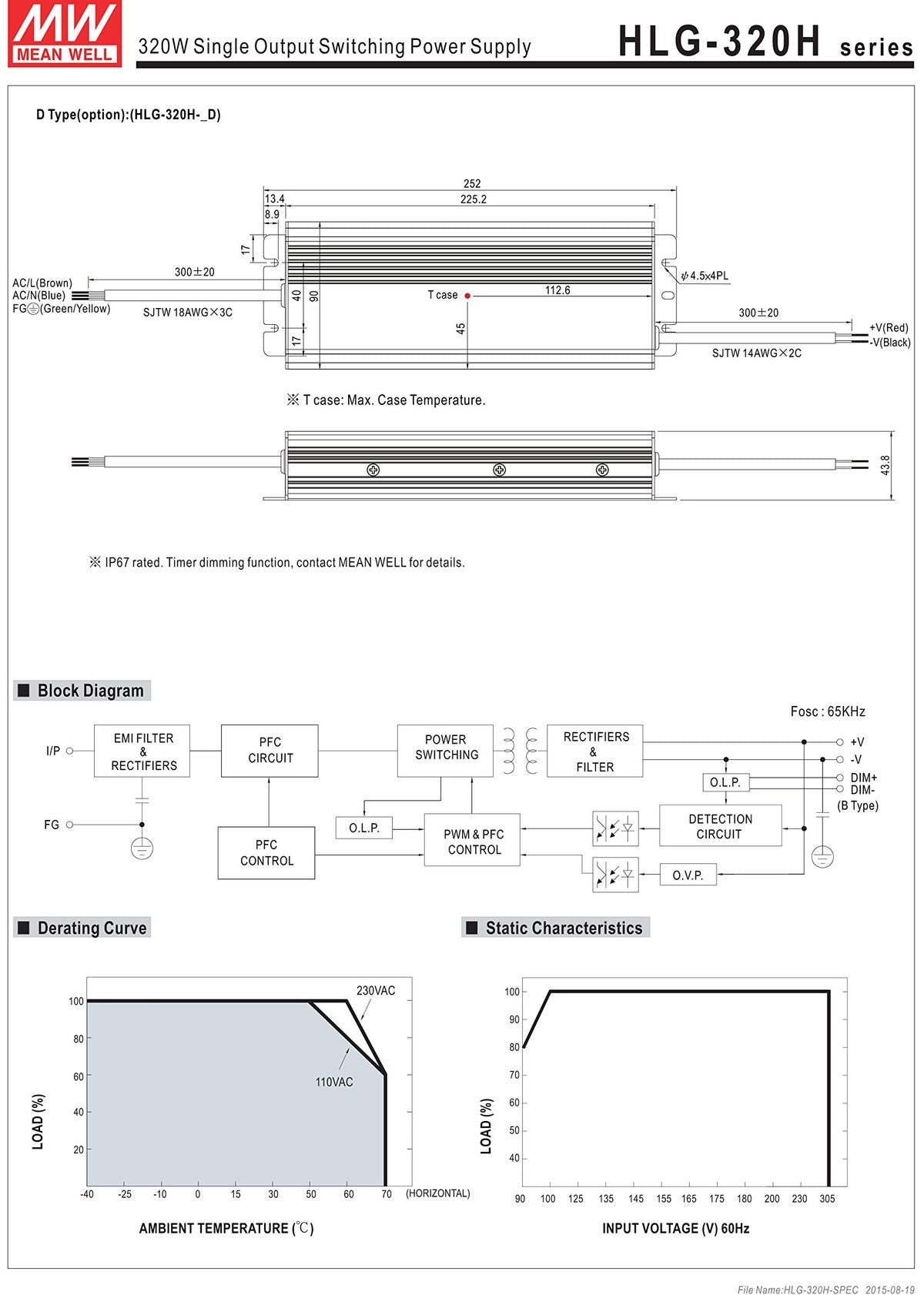 Q: Is the HLG-320H-15B power supply suitable for outdoor use?A: Yes, the HLG-320H-15B features an IP67 rating, which means it is designed for outdoor installations, ensuring protection against dust and water ingress.