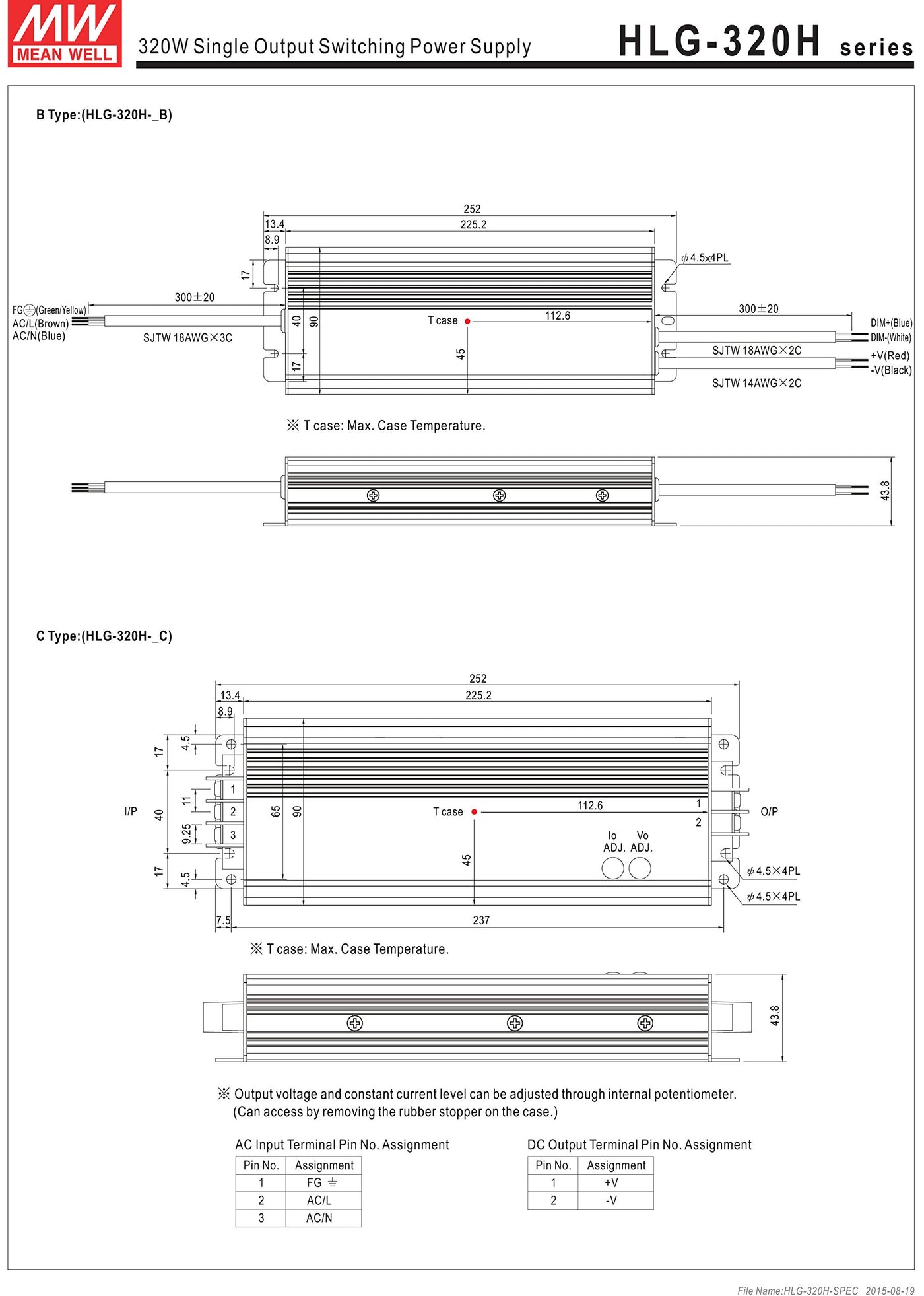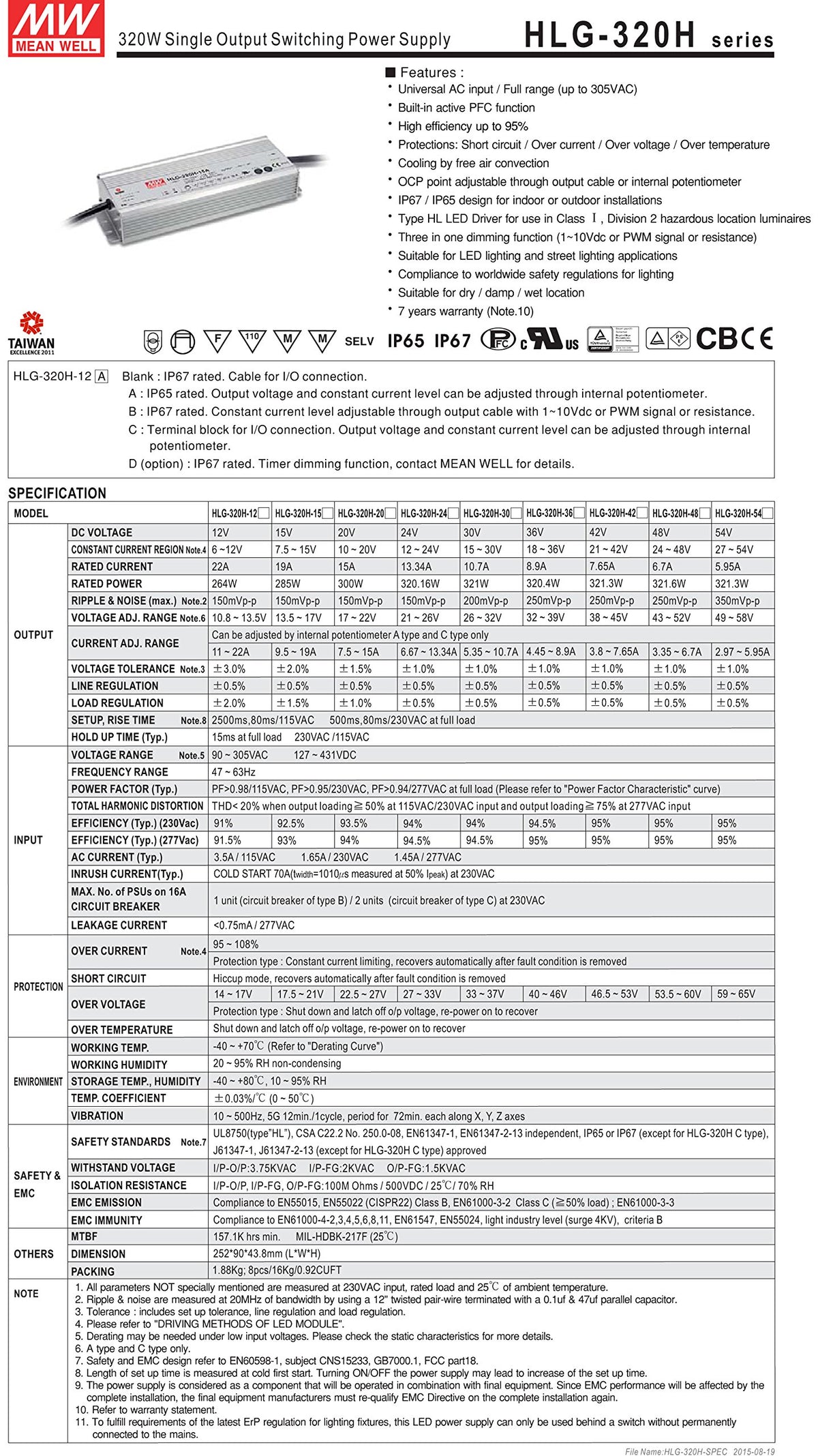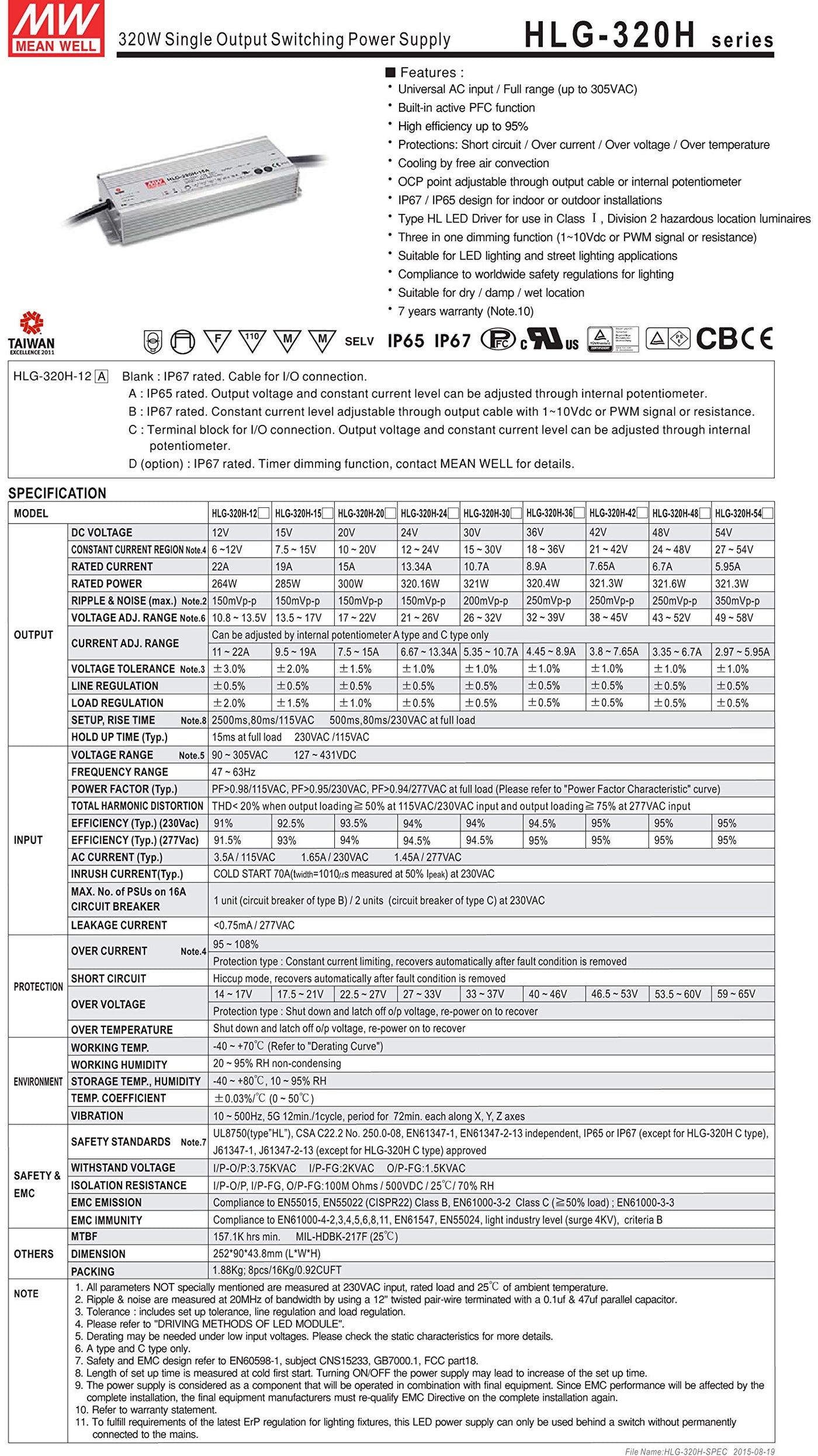 Features Universal AC input (up to 305VAC) / Full range Protections: Short circuit / Over current / Over voltage / Over temp. Built-in active PFC function High efficiency up to 96% IP67 / IP65 design for indoor or outdoor installations (except for HLG-320H C-Type) Output current adjustable through output cable or internal potentiometer Cooling by free air convection Suitable for LED lighting and street lighting applications Meet 4kV surge immunity level (IEC61000-4-5) No load power consumption <0.5W at remote off (HLG-600H) Type HL LED Driver for use in Class I, Division 2 hazardous location luminaires LED indicator for power on (HLG-600H A-Type only) Multiple models for choice: A-Type: IP65 rated. Output voltage and constant current level can be adjusted through internal potentiometer B-Type: IP67 rated and built-in 3 in 1 dimming function (1~10VDC*, PWM signal, or resistance) (*: 0~10VDC for HLG-600H) C-Type: Terminal block for I/O connection (HLG-320H only) Blank-Type: IP67 rated. Cable for I/O connection (HLG-320H only) D-Type(option): IP67 rated. Timer dimming function, contact MEAN WELL for details (HLG-320H only) 7 years warranty