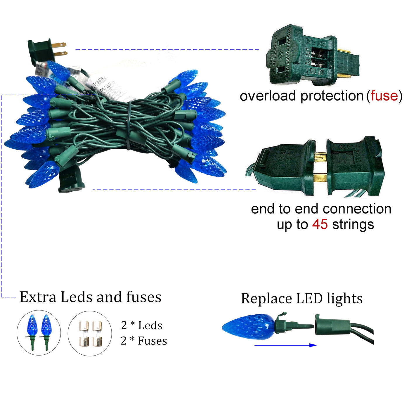 Blue Led Light1.Ul Certification2.Outdoor And Indoor3.50 Led Lights4.Led Light Is 3Volt, 0.068Watt,0.02Ampere5.Led Lights Is Blue.6.C6 Strawberry Bulb Is Blue.7.Green Wire8.Total Length 18 Feet Including Lead Cord 19.5 Inches, Tail Cord 4 Inches, 4 Inches Distance Between Each Led Light 9.C6 Strawberry Christmas Lights Is Rated 120Volt, 4.8Watt10.C6 Strawberry Christmas Lights Is Divided Into Two Groups, Be Connected In Parallel11.Can Be Connected End To End (No More Than 216 Watts), No More Than 45 Strings12.Extra Include 2Pcs Fuses, 2Pcs Extra Led Lights13.The Male Plug With 2Pcs Fuses, When Needed, You Can Replace Fuse14.C6 Strawberry Christmas Lights Is A Very Nice Christmas Decoration. Fairy Lights For Christmas Tree, Balcony, Bedroom, Patio, Garden, Holiday, Party.
