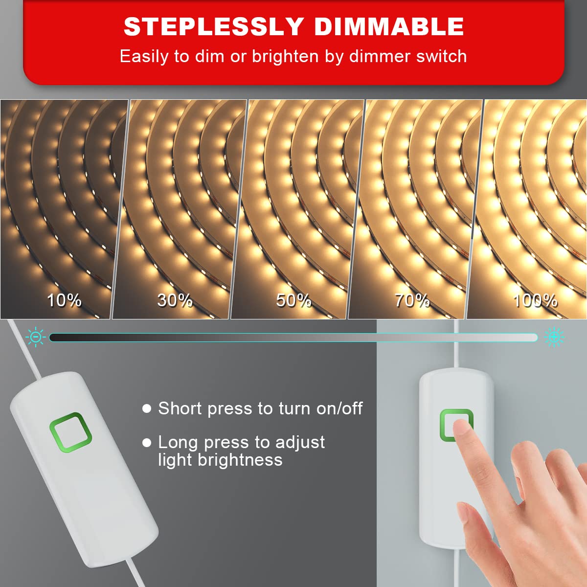 Q: How do I control the brightness of the LED strip lights?A: The MY BEAUTY LIGHT LED Strip Lights come with a unique dimmer control. You can adjust the brightness by long-pressing the dimmer to dim or brighten the lights. A short press allows you to turn the lights on or off, and the memory function restores the last brightness setting for convenience.