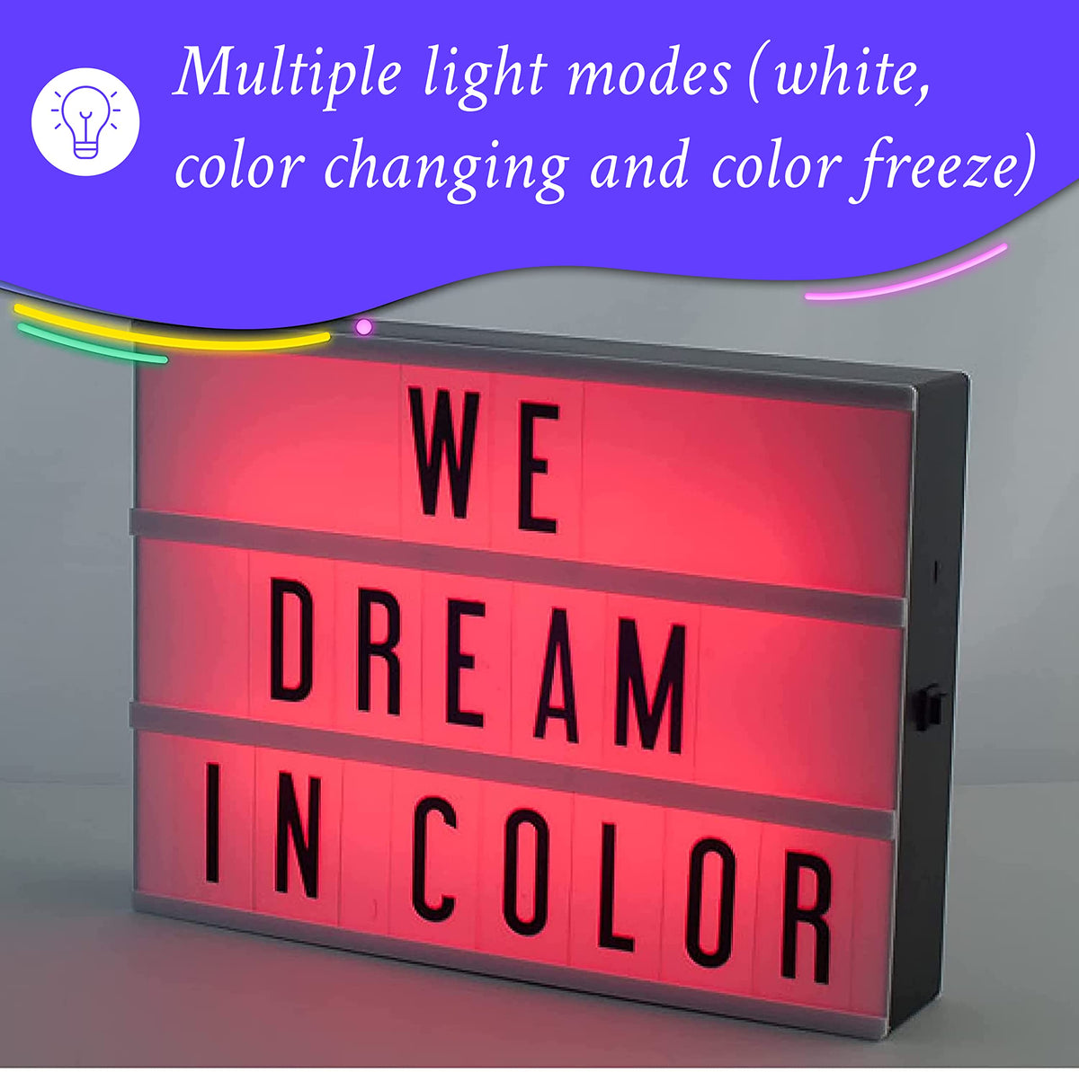 Q: How do the color-changing LEDs work?A: The Cinema Light Box features color-changing LEDs that allow you to select from a vibrant array of hues, helping you set the perfect mood and match your message effectively.