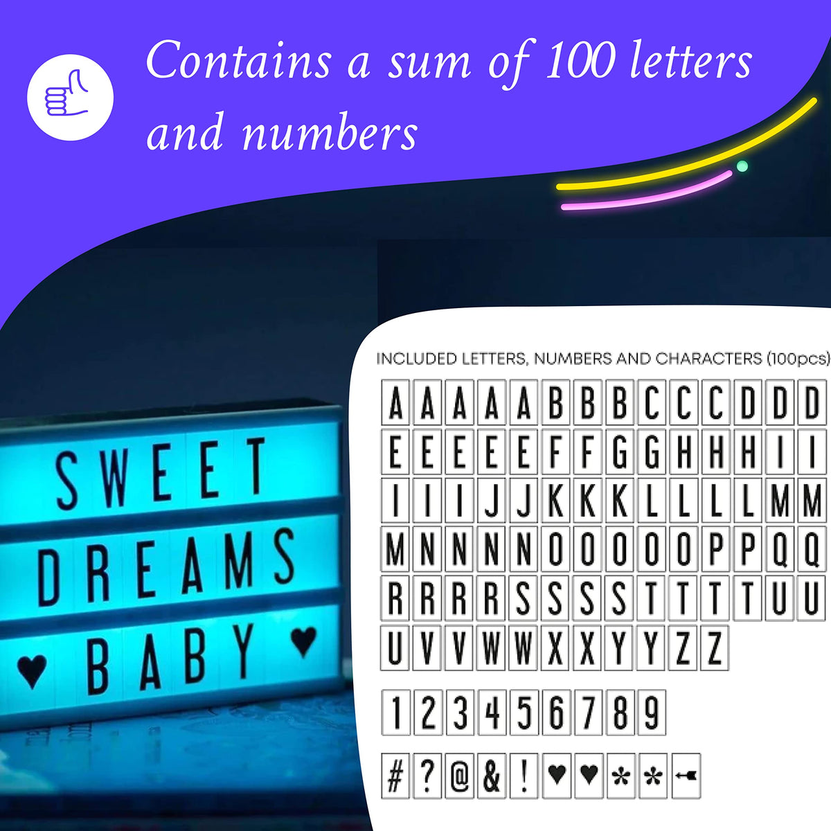 - **Personalized Messages**: Easily customize your messages with 100 LED light letters and numbers, allowing for effortless rearrangement and eye-catching displays that reflect your personality and style.