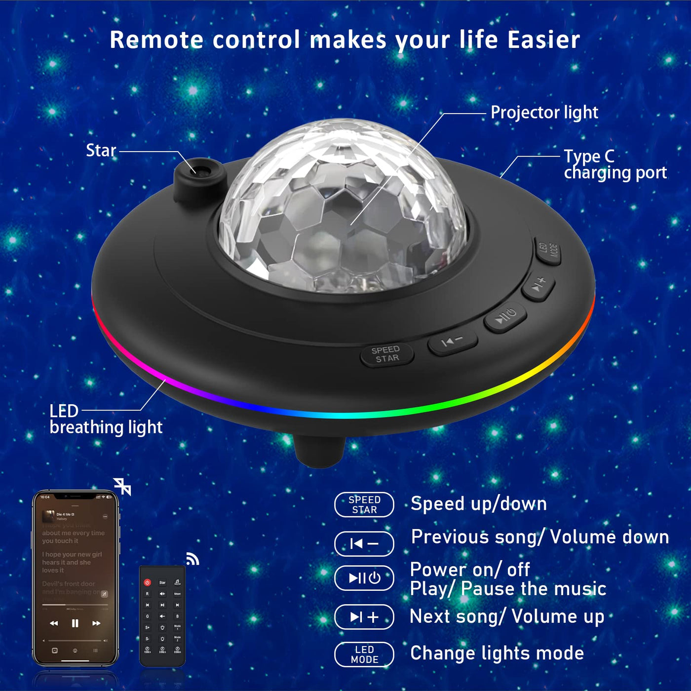 - ?? **Bluetooth Music Speaker & Music Sync:** Play your favorite music via Bluetooth and enjoy the starlight that syncs with the rhythm, enhancing your relaxation experience.
