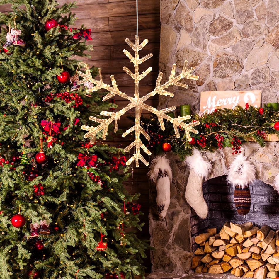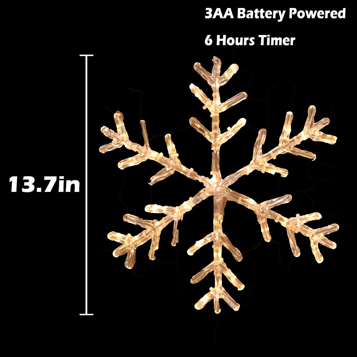 Experience the magic of the Acrylic Snowflake Light! With a diameter of 13.7 inches, this intricately designed decoration adds an elegant touch to your holiday decor. Emitting a warm white glow from its 30LED bulbs, it creates a cozy and enchanting atmosphere. The built-in 6-hour timer allows for effortless operation, while the 19.7-inch lead wire and battery-powered design offer versatile placement options. From windows to doorways, it's the perfect addition to your Christmas decorations. Give the gift of holiday delight with this exquisite acrylic snowflake light, a thoughtful present that brings joy and wonder to any home.