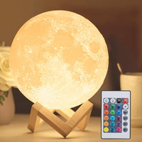Q: How do I control the brightness and color settings of the moon lamp?A: The moon lamp comes with a remote control, enabling you to easily change brightness levels, switch colors, and select from 4 light modes.