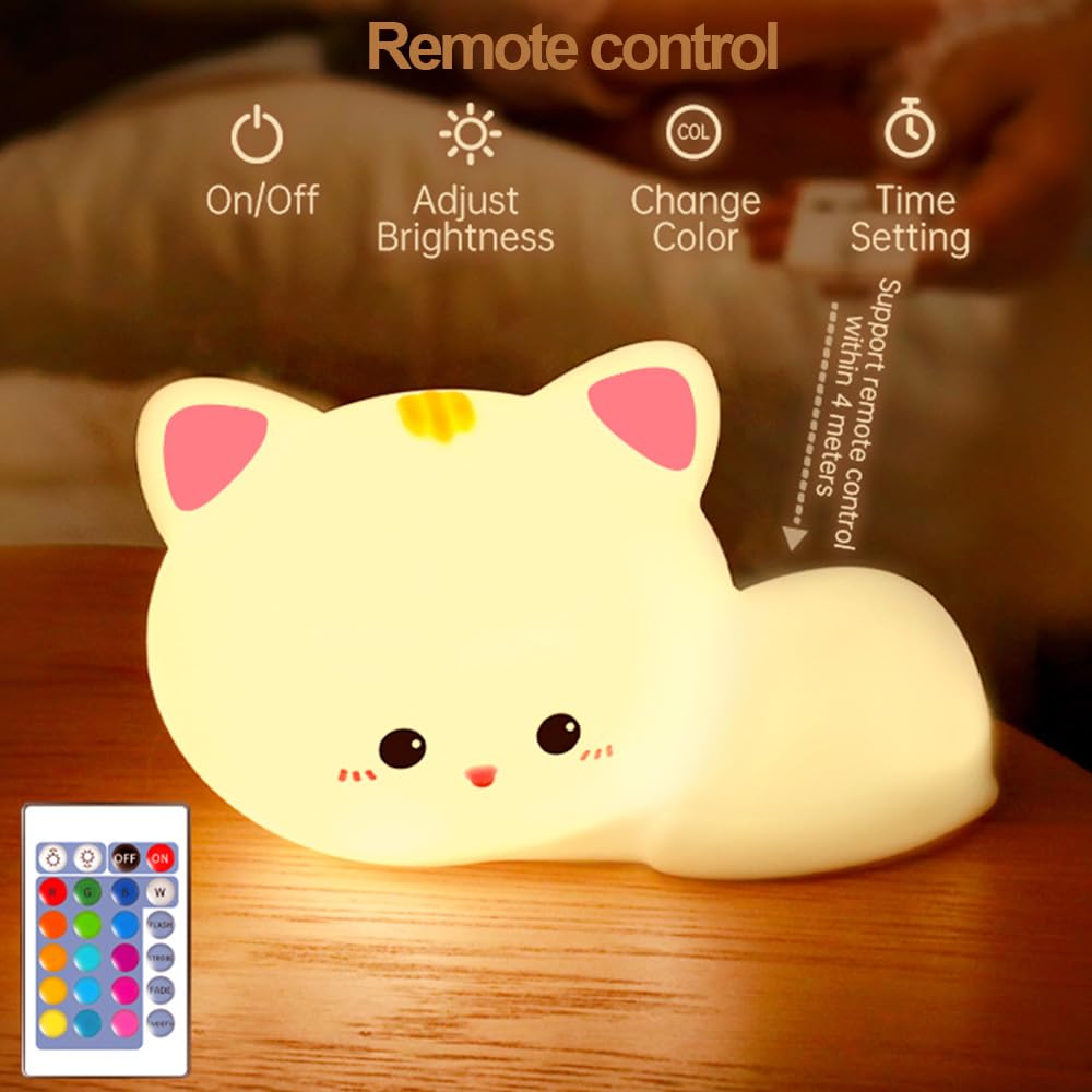 Myratts Led Cute Cat Night Light, 16 Colors Dimmable Nursery Kawaii Nightlight, Super Squishy Silicone USB Rechargeable Remote C