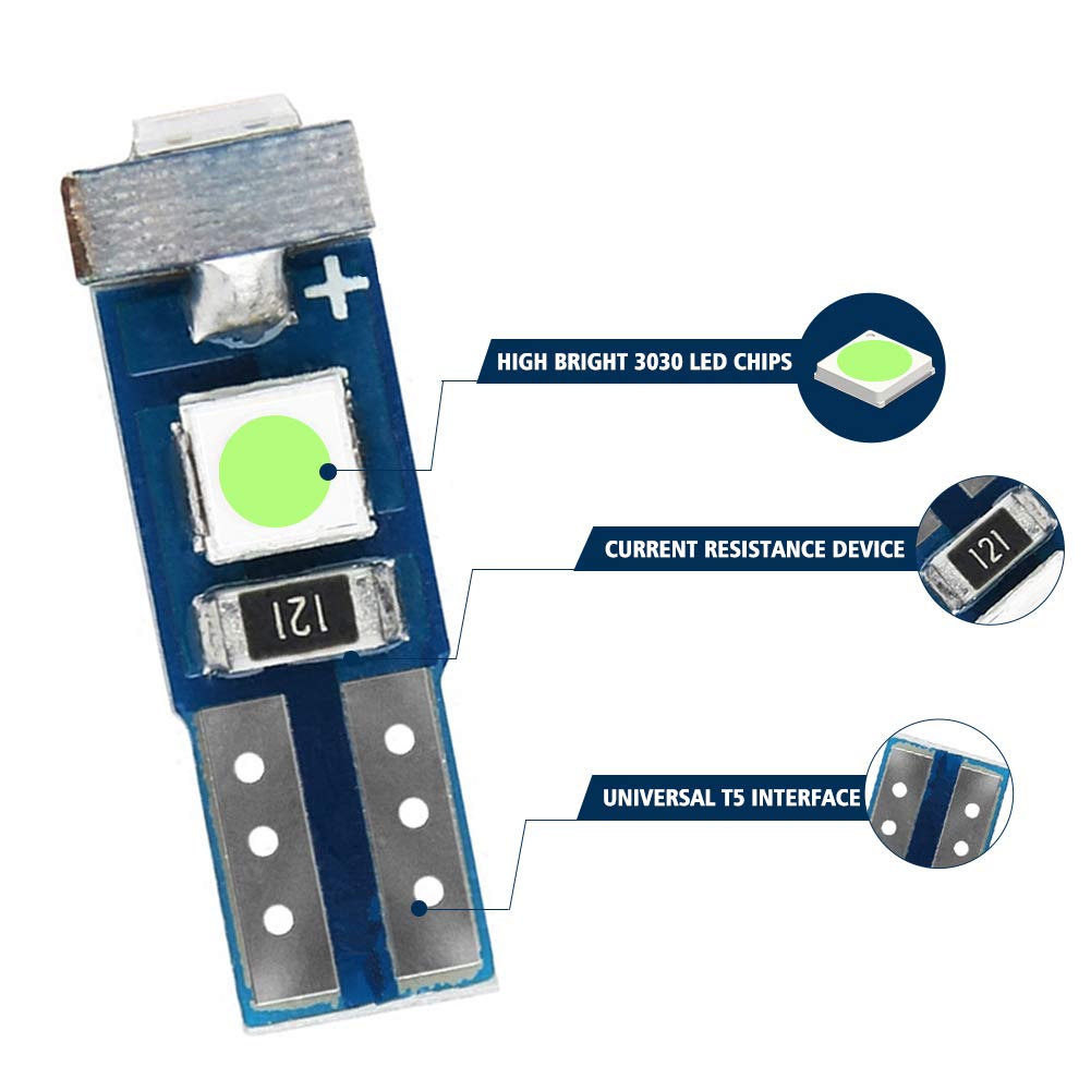 Q: What advantages do the Nanpoku T5 LED bulbs offer compared to traditional bulbs?A: The Nanpoku T5 LED bulbs feature a 3030 LED chipset, which provides brighter illumination compared to traditional bulbs. They also consume less power and have a longer lifespan, making them a more efficient choice for vehicle lighting.