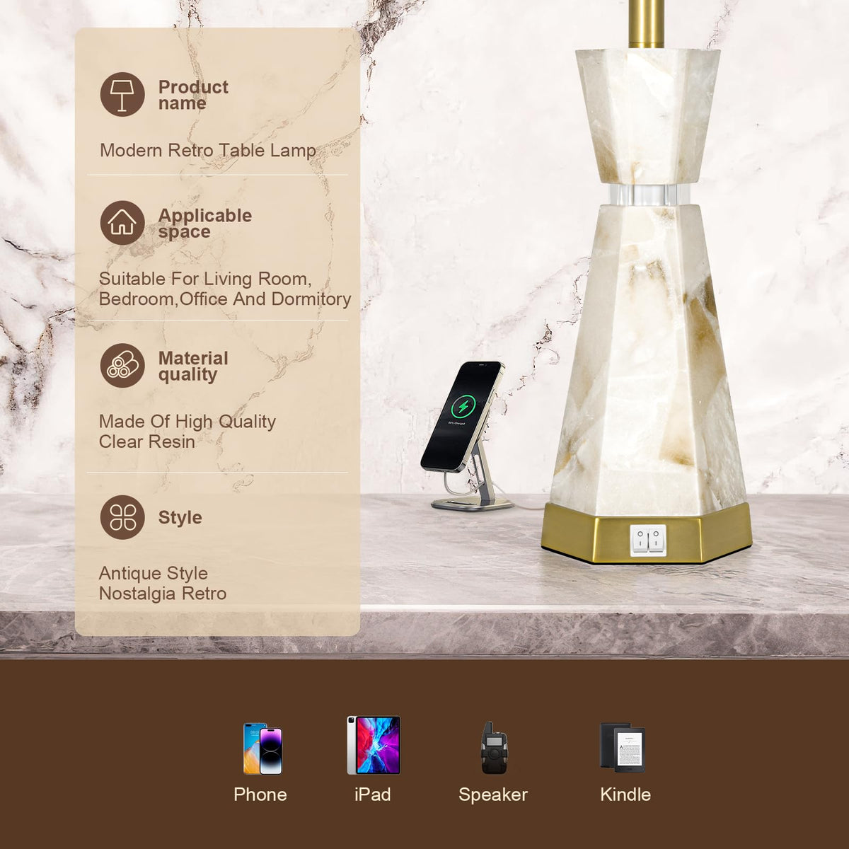 This table lamp is cut into a trapezoidal shape using natural alabaster, and then spliced into a hexagonal shape. The night light is inserted into it, and the brass bottom is equipped with a USB port, which can charge two mobile devices at the same time. With dual mini switches, the light can be adjusted according to the mood or different occasions. This set of two lamps is the best choice for decorating your living room, bedroom or even office.