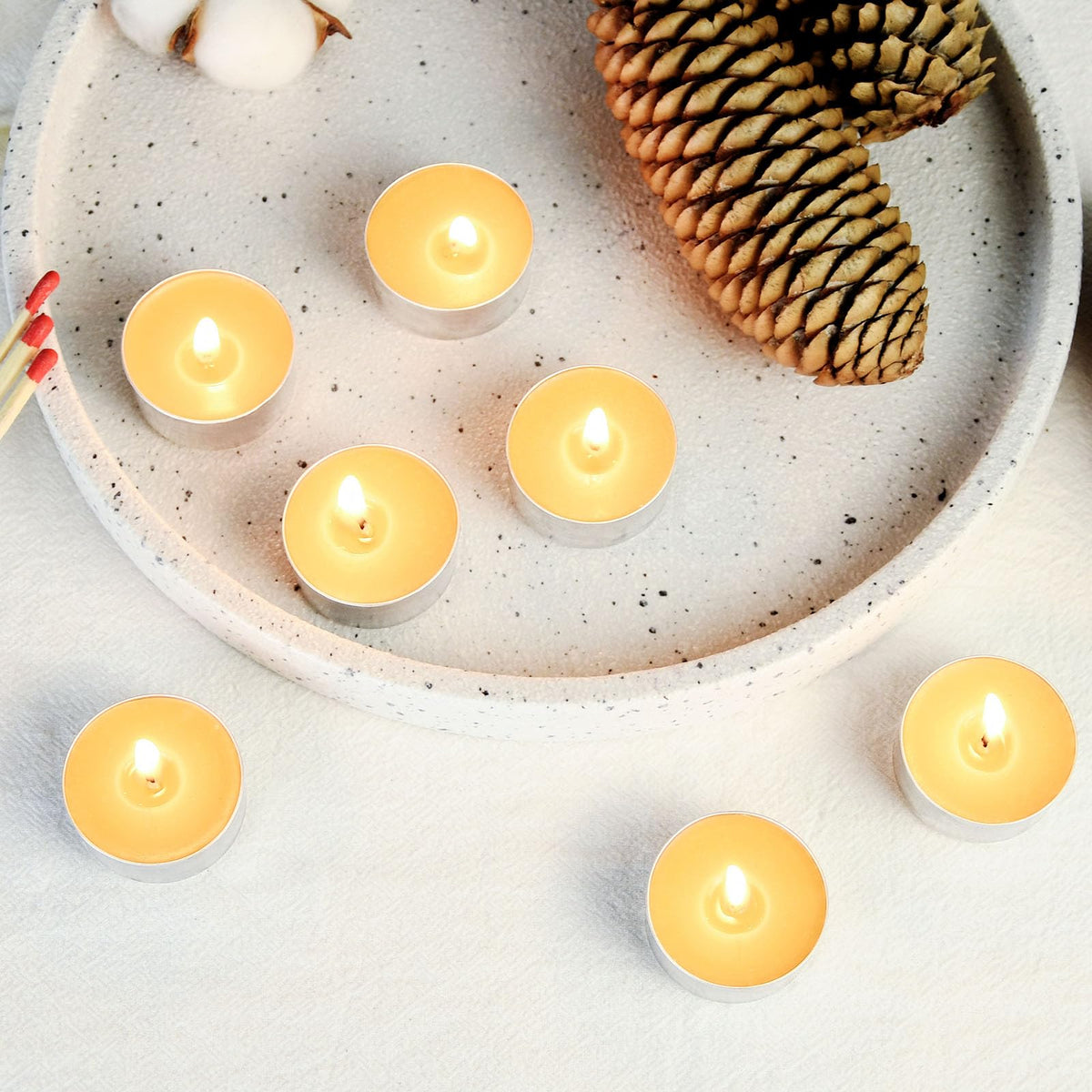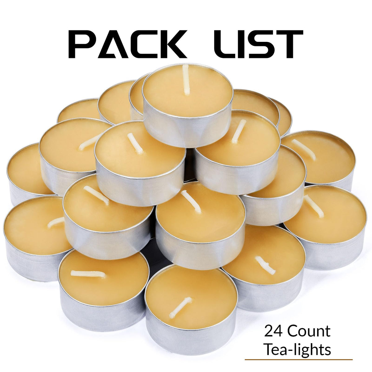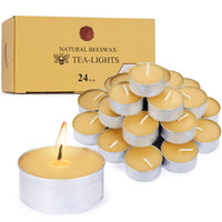 TEALIGHT CANDLE MATERIAL: These small candles are made of 100% Pure Beeswax and Cotton Wick, filled in Metal Aluminum Cup. lead-free wick, paraffin free, making them a safe and responsible choice for your home. | PACKAGE: There will come 24 Count beeswax tea candles in each box, if some candles are missing from the package, please contact us. | SMALL CANDLE SIZE:1.48 inch (37.5mm) diameter, 0.7 inch (17.8mm ). Suit to Most of tealight and votive candle holders | LONG-LASTING BURN TIME: 100% pure beeswax candles burns slowly, when they made with a compatible wick, there will be barely no drip and almost no wax waste, then they will last longer burning time. our beeswax candles are made of 100% pure beeswax, can last 4 to 5 hours burning time, They are particularly suitable for party gifts, emergency lights in case of power outages, restaurant dining tables, and indoor burning. | PERFECT FOR ROMANTIC NIGHTS: They’re great for Valentine’s day, weddings, anniversaries, home décor, Christmas holidays, pool parties, church, emergency. and they are perfect for calming meditation, enhancing events and get-togethers, or warming up cold nights, our beeswax tea lights set the mood for any occasion.