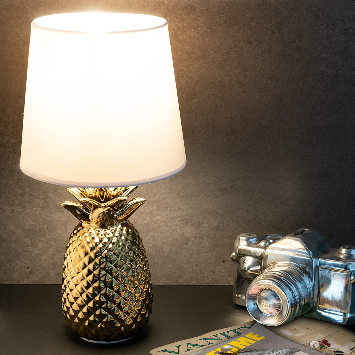 Q: How should I clean the Navaris Gold Pineapple Table Lamp?A: To clean the lamp, gently wipe the ceramic base and shade with a soft, damp cloth. Avoid using harsh chemicals to prevent damage.