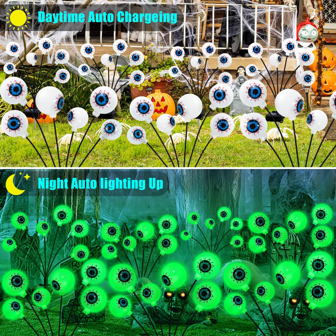 Q: What kind of atmosphere do these lights create?A: These spooky eyeball lights feature a 3D design and bloodshot eyes combined with green illumination, effectively creating a chilling Halloween atmosphere in your outdoor space.