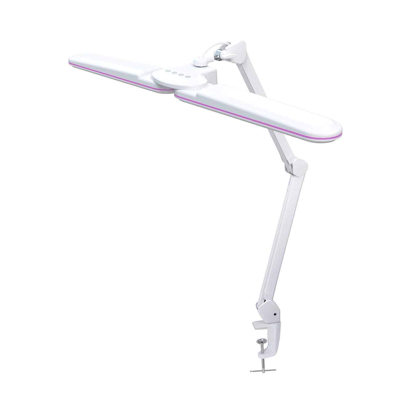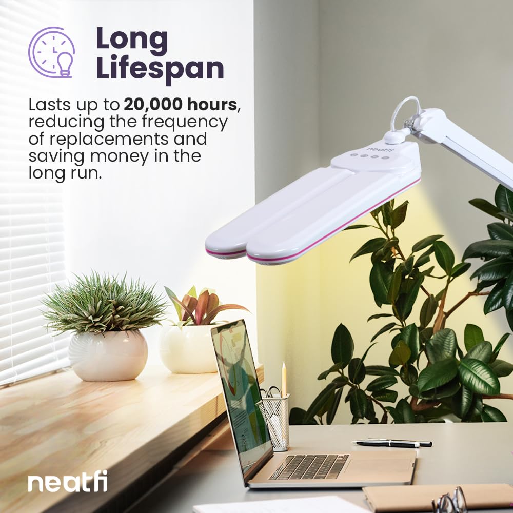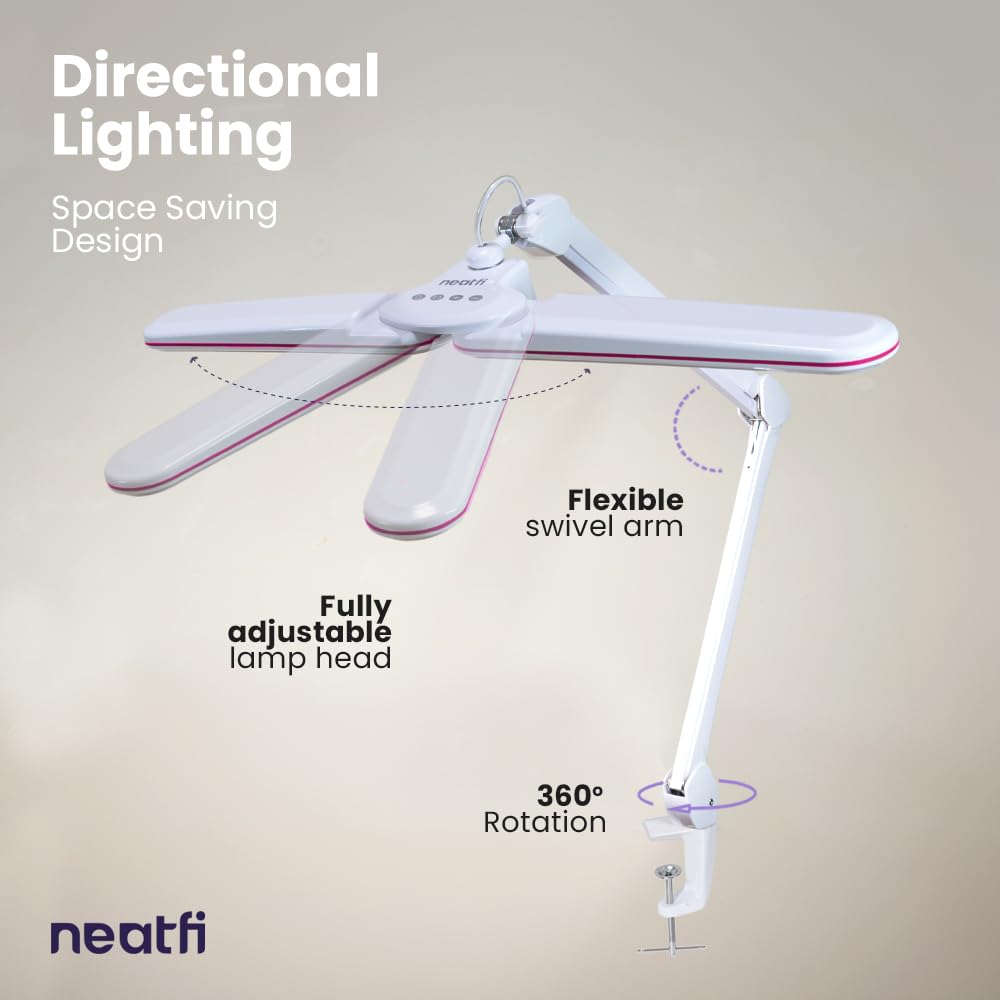 The Neatfi Elite HD XL Task Lamp is a versatile lighting solution designed for desks and workspaces. With a sleek clamp design, it's easy to attach to surfaces up to 17 inches wide. Featuring 3 light modes and 90PCS SMD LED bulbs, it provides bright illumination while being gentle on the eyes. The non-polar dimming feature allows for precise adjustment of brightness levels, ensuring optimal lighting for any task. Look for the model with the distinctive green ring for added style and functionality.