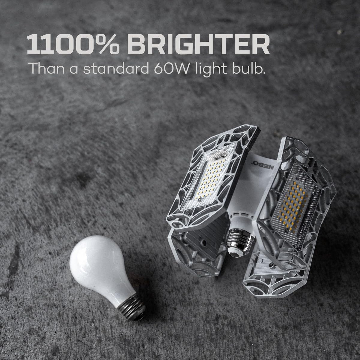 Q: Is the NEBO Garage Light energy efficient?A: Absolutely, the NEBO Garage Light is energy efficient and provides 1100% more brightness compared to a standard 60W bulb, helping you save on energy costs.
