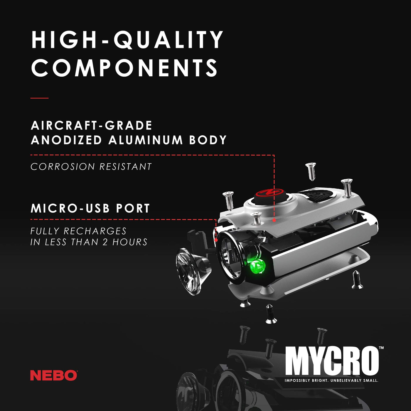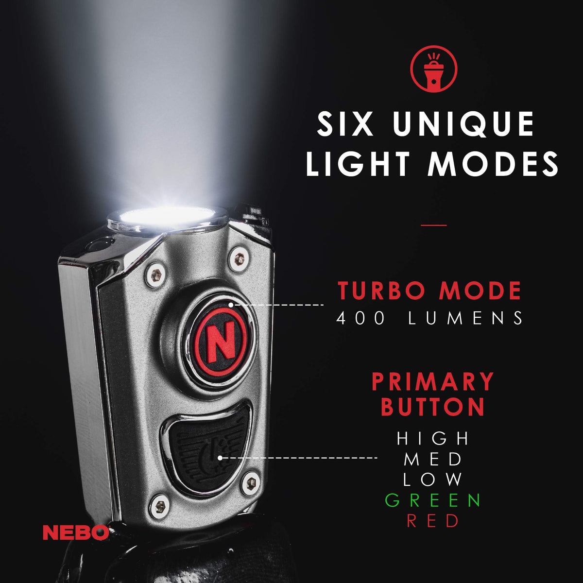 NEBO MYCRO Keychain Flashlight | 400 Lumens, 40 Hours Run Time, Rechargeable EDC Light with 6 Red, Green & White Modes, Water Re