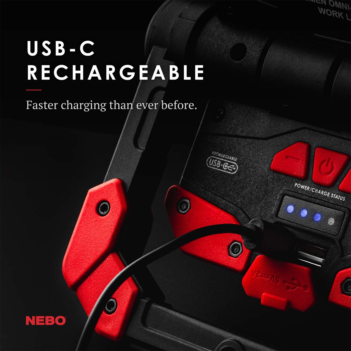 NEBO OMNI 2K Work Light - 2000 Lumen Rechargeable COB LED Flashlight with USB Power Bank, Six Light Modes, Red and Black, Portable Design