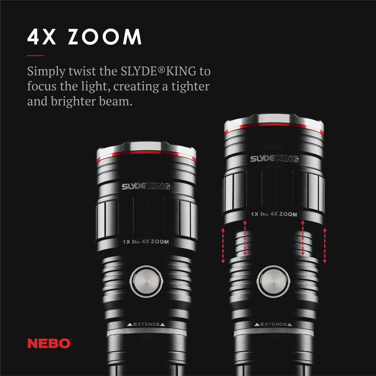 The SLYDE KING LED flashlight comes standard with all the features that you would expect from a NEBO light and many more; the SLYDE KING comes standard with programmable memory power settings for each light mode and it has a new COB red light function | 4 light modes: The bright LED flashlight provides you with 50-500 lumens (depending on your brightness setting) that shine for 2.5-19 hours at a distance of up to 160 meters; the COB work light provides you with 50-500 lumens (depending on your brightness setting) that shine for 3.5-20 hours at a distance of up to 37 meters; the red COB light provides you with 4-40 lumens (depending on your brightness setting) that shine for 5.5-60 hours at a distance of up to 9 meters; and the red COB hazard flasher provides 40 lumens of flashing red light that shine for 24 hours at a distance of up to 9 meters | Operation: The NEBO SLYDE KING LED flashlight and work light has an ergonomic barrel with a thoughtfully placed side positioned on/off button; you can also hold the on/off button to dim the light to your desired brightness; the COB work light will automatically turn on when you slide it open | Design: The NEBO SLYDE KING is crafted from anodized aircraft-grade aluminum, and it is impact and water-resistant; it has a front-facing tactical edge with a powerful magnetic base in the back and it is powered by one lithium-ion battery