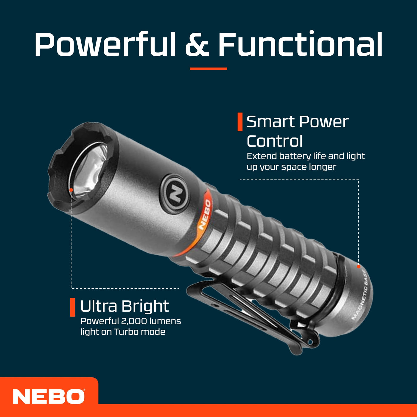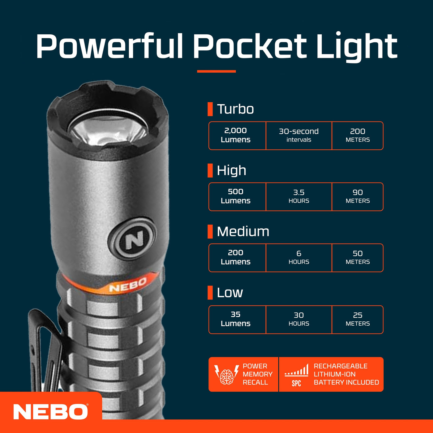 NEBO TORCHY 2K: The 2,000 lumen TORCHY 2K packs a big punch in a small package. With 5 light modes and a magnetic charging dock, it is truly packed with features.