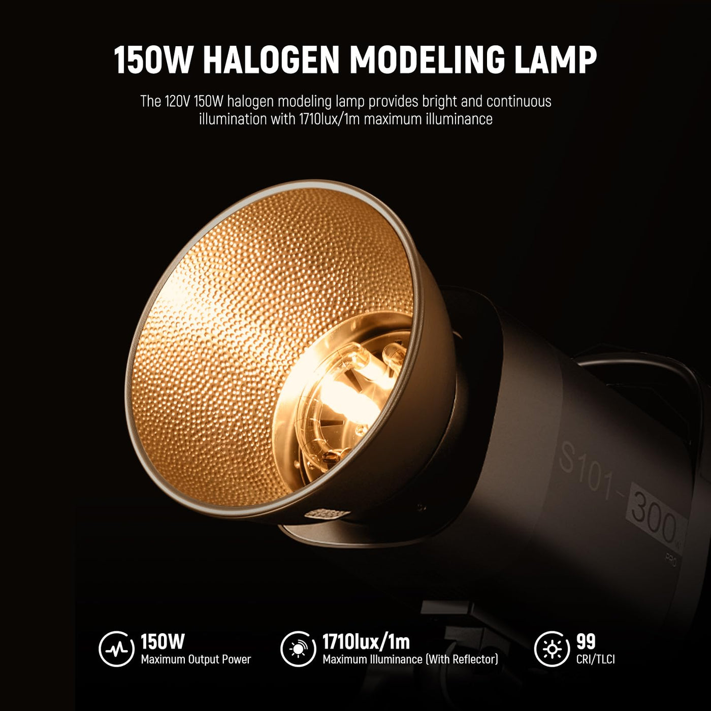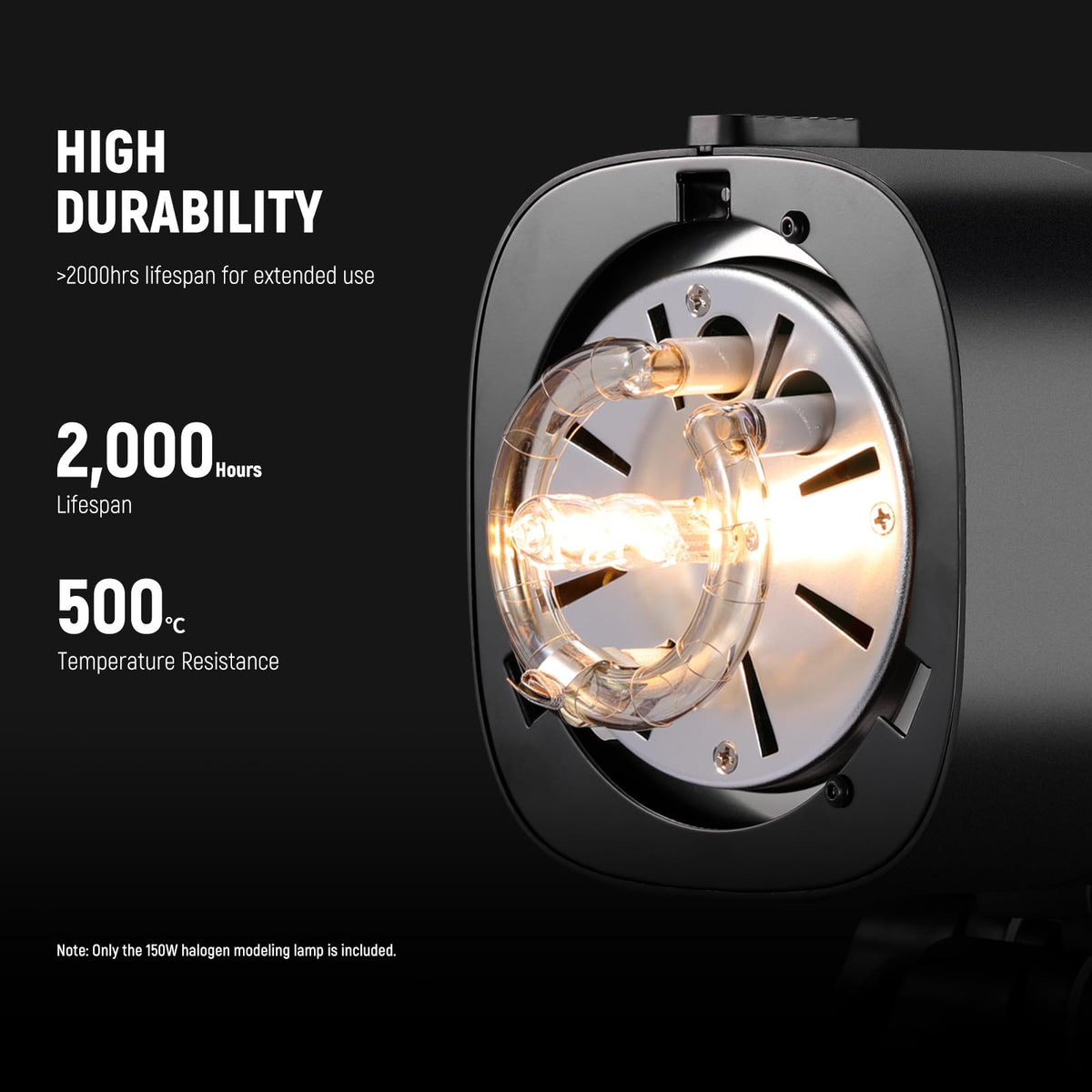 Product Descriptions The 150W halogen modeling lamp is a bright and warm (2600K) light source designed for NEEWER S101 series studio flashes. With 9 adjustable brightness levels (L1-L9) and a heatproof porcelain E26 base, it offers precise lighting control for various photography applications. Specifications Item Type: Modeling Lamp Compatibility: NEEWER S101 Series Flash Application: Portrait/Product Photography Main Features: 9 Dimming Levels Mounting Points: E26 Base Main Material: Halogen Maximum Power: 150W Maximum Illumination: 1710lux/1m Color Temperature: 2600K Color Mode: Warm CRI/TLCI: 99 Package Contents 1 x Halogen Modeling Lamp