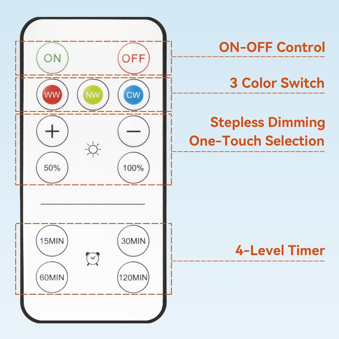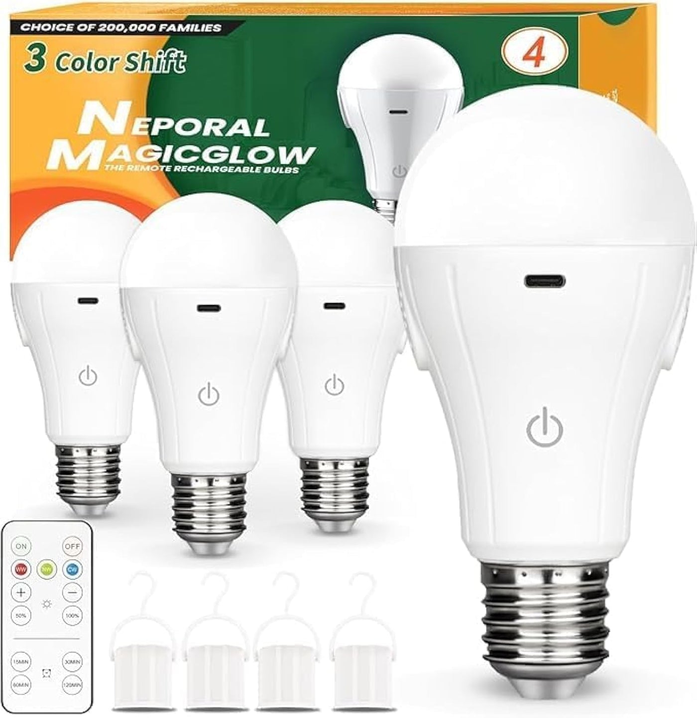 3 Colors SHIFT + STEPLESS DIMMING - NEPORAL MagicGlow rechargeable light bulbs feature 3 light color choices (cool white/daylight/warm white) with stepless dimming function. Now, you can choose the perfect color to set the right ambiance for any occasion! | 800 LUMENS, BRIGHTER THAN PUCK LIGHT - NEPORAL MagicGlow battery-operated light bulb has a powerful 15W LED, while e26 puck light only offers 3W at most. The high brightness provides enhanced visibility. | USB RECHARGEABLE WITH CHARGING INDICATOR - MagicGlow is USB-C rechargeable. Each box includes 2 USB cables, so you can recharge the light bulb anytime without worrying about battery levels or contributing to environmental waste from disposable batteries. | A19 FIT IN ALL LAMP - Worried that rechargeable LED bulbs might be too large for your lamp harp or that puck lights won't fit your table lamp? Fear not! MagicGlow's A19 size is a universal standard, compatible with most LED light bulb fixtures. | REMOTE CONTROL + TOUCH CONTROL - Each box of MagicGlow comes with 2 remote controllers. One remote can control multiple MagicGlow bulbs. You can also tap on the light bulbs to control them directly. | WITH 4 LEVEL TIMER - Want to keep a night light on without skyrocketing electric bills? Use the timer to automatically turn off the light after a set time. Choose from 15min/30min/60min/120min options to suit your preference. | WITH PORTABLE HOOK - While other remote light bulbs lack a hook or have undetachable ones, NEPORAL MagicGlow is equipped with a removable hook. It serves as both a flashlight and a hangable work light!