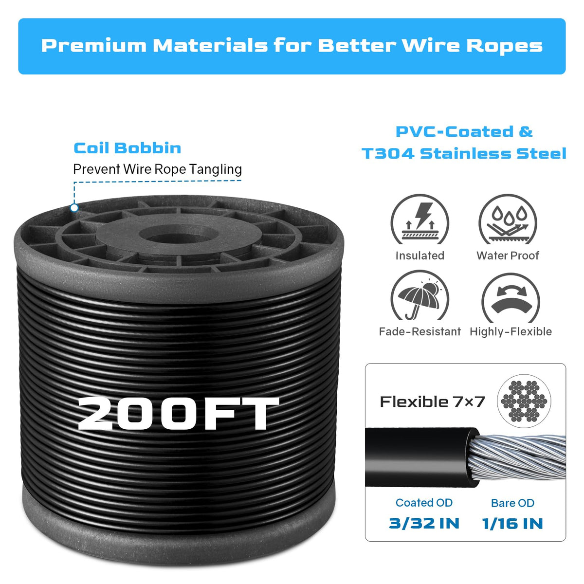 Black Vinyl Coated stainless steel cable is insulated and Flexible,Waterproof, Rust-resistant, Safe and Durable.