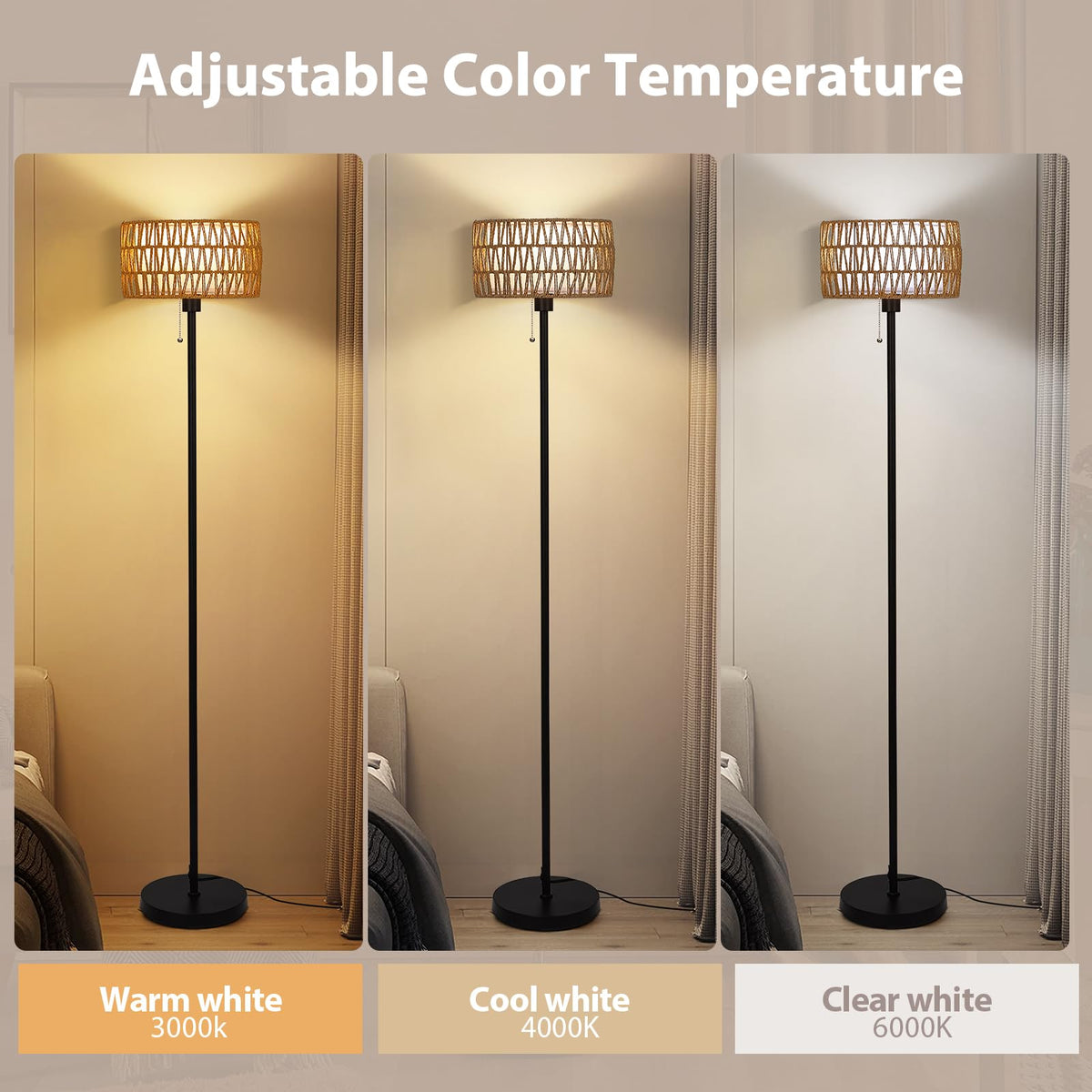 Netin Rattan Floor Lamp For Living Room, Boho Standing Lamp With 3 Color Temperatures, Farmhouse Floor Lamp Wicker Lamp Double S