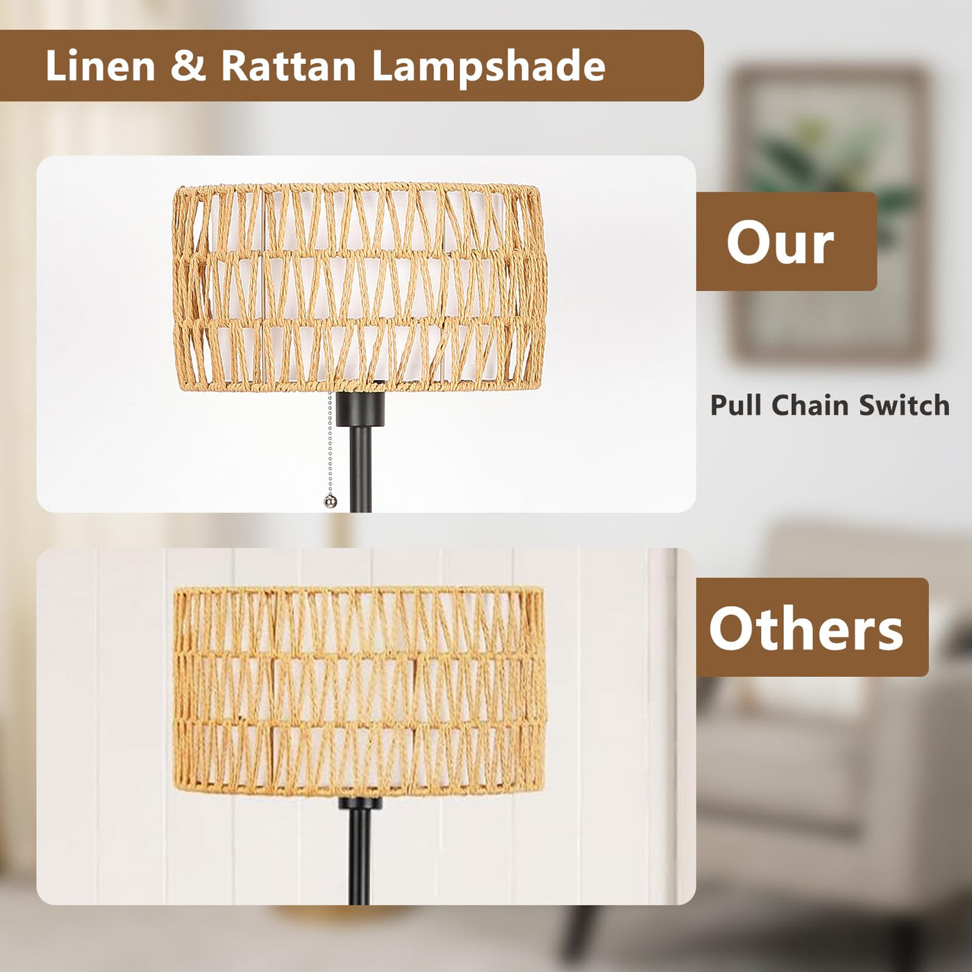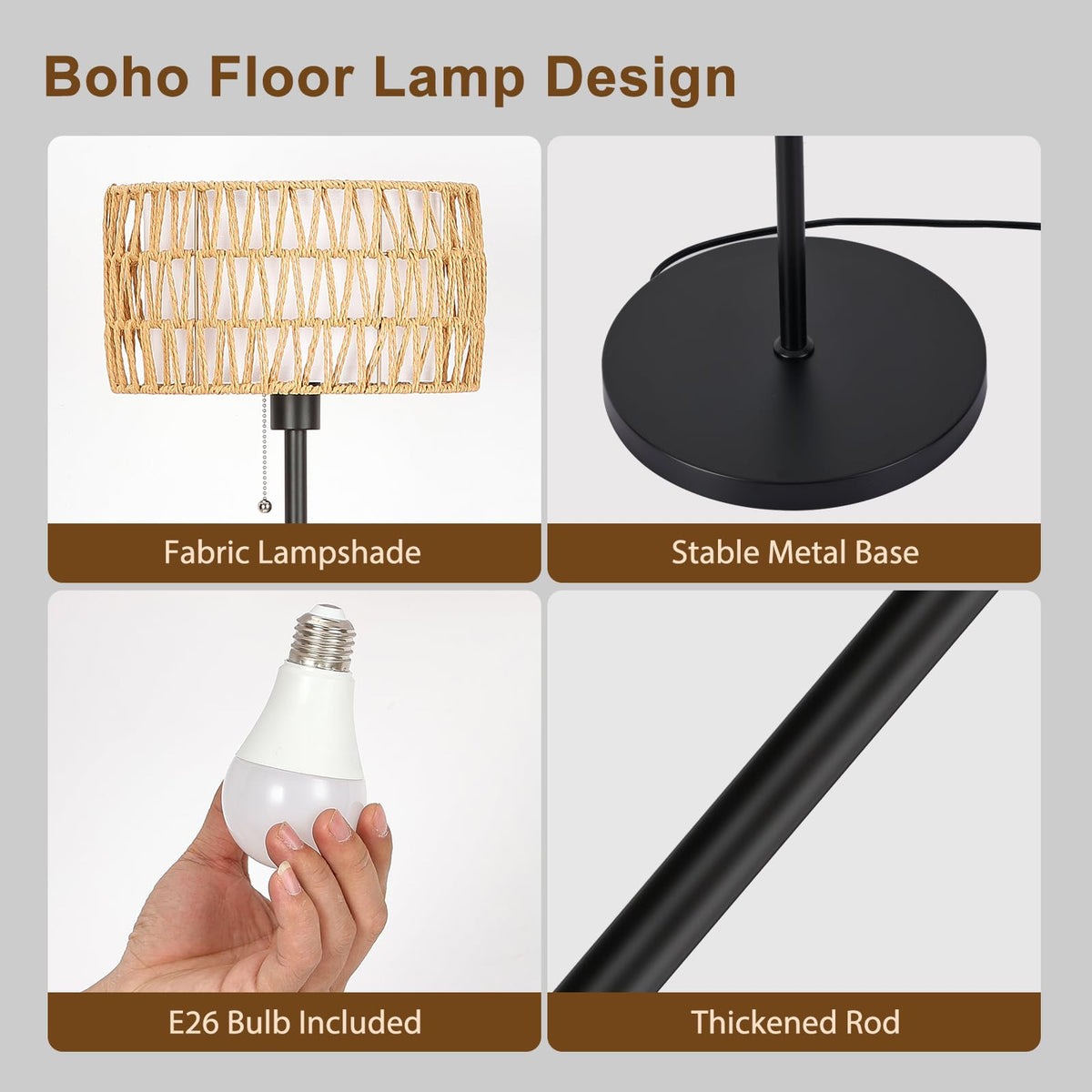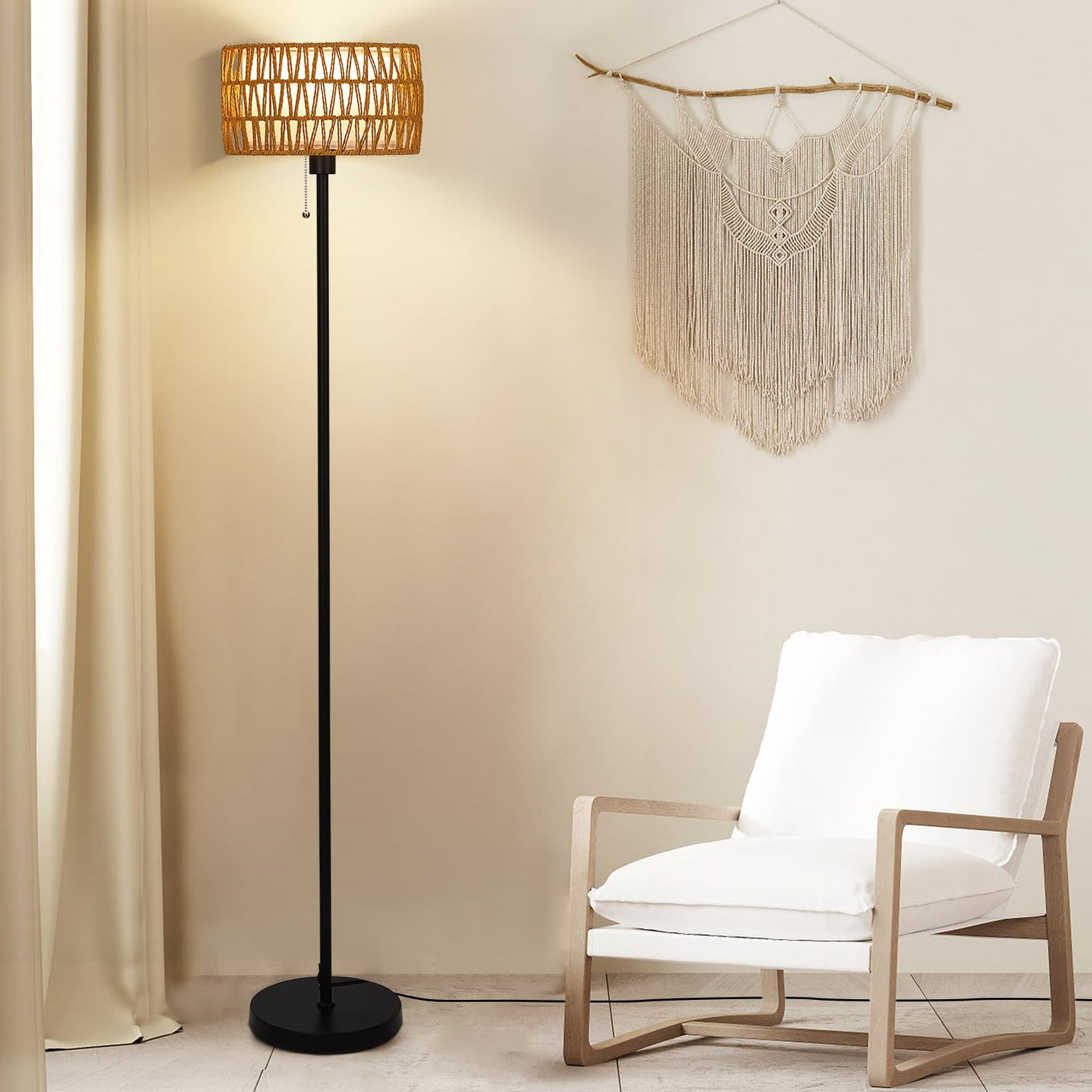 Introducing our Netin Woven Rattan Shade Lamp Series, where simplicity meets elegance in a 61 H floor lamp with a steady 10'' weighted base. This exquisite piece features a quality handcrafted double-layered natural rattan lamp shade that seamlessly blends nature with modern style, emitting a soft and inviting light. Crafted with care, the pole of this tall floor lamp is made of premium durable metal, ensuring longevity and stability. The 10'' weighted base adds an extra layer of security, making it safe around children and pets. Its compact design not only saves space but also adds a touch of style to any home decor, whether coastal, boho, or rustic.