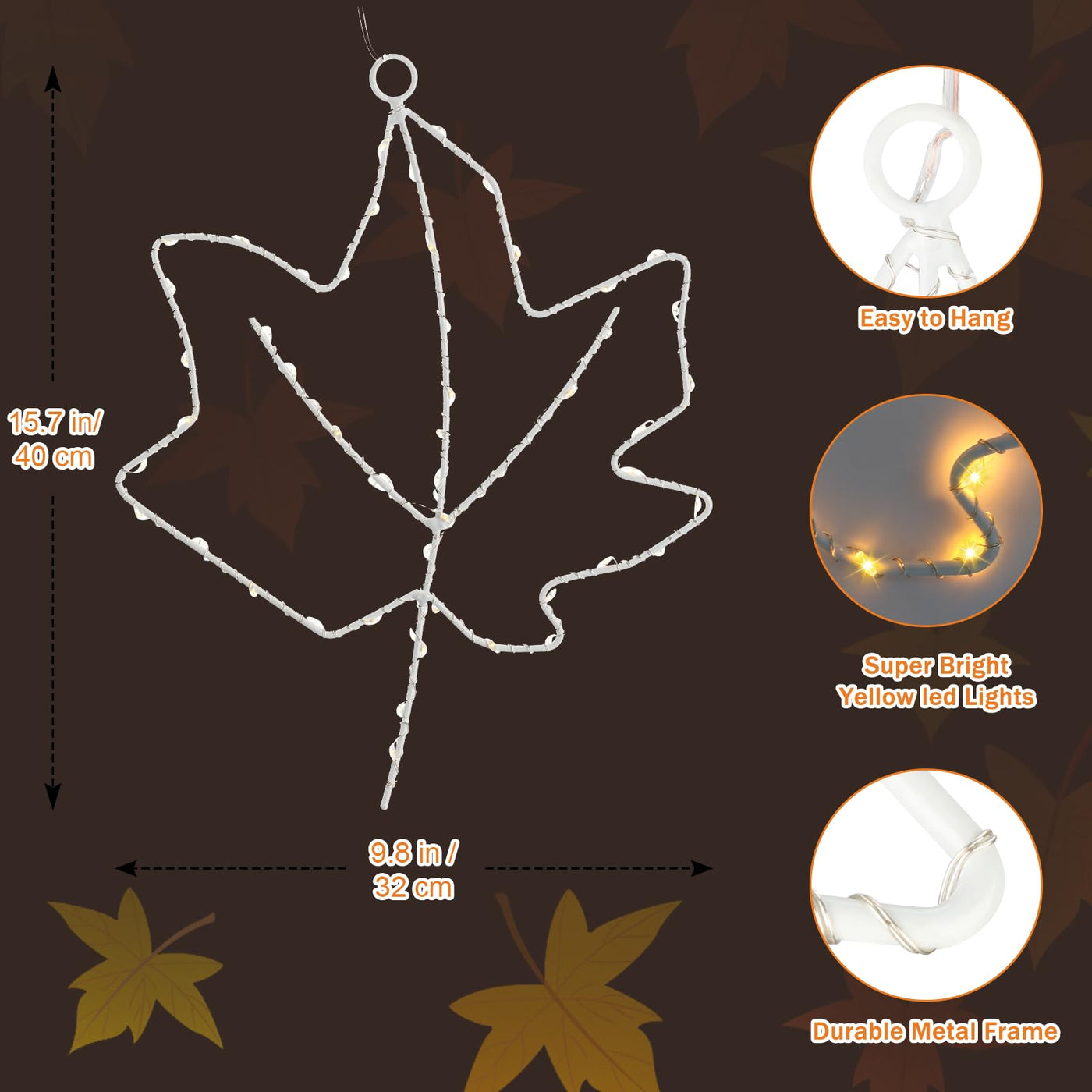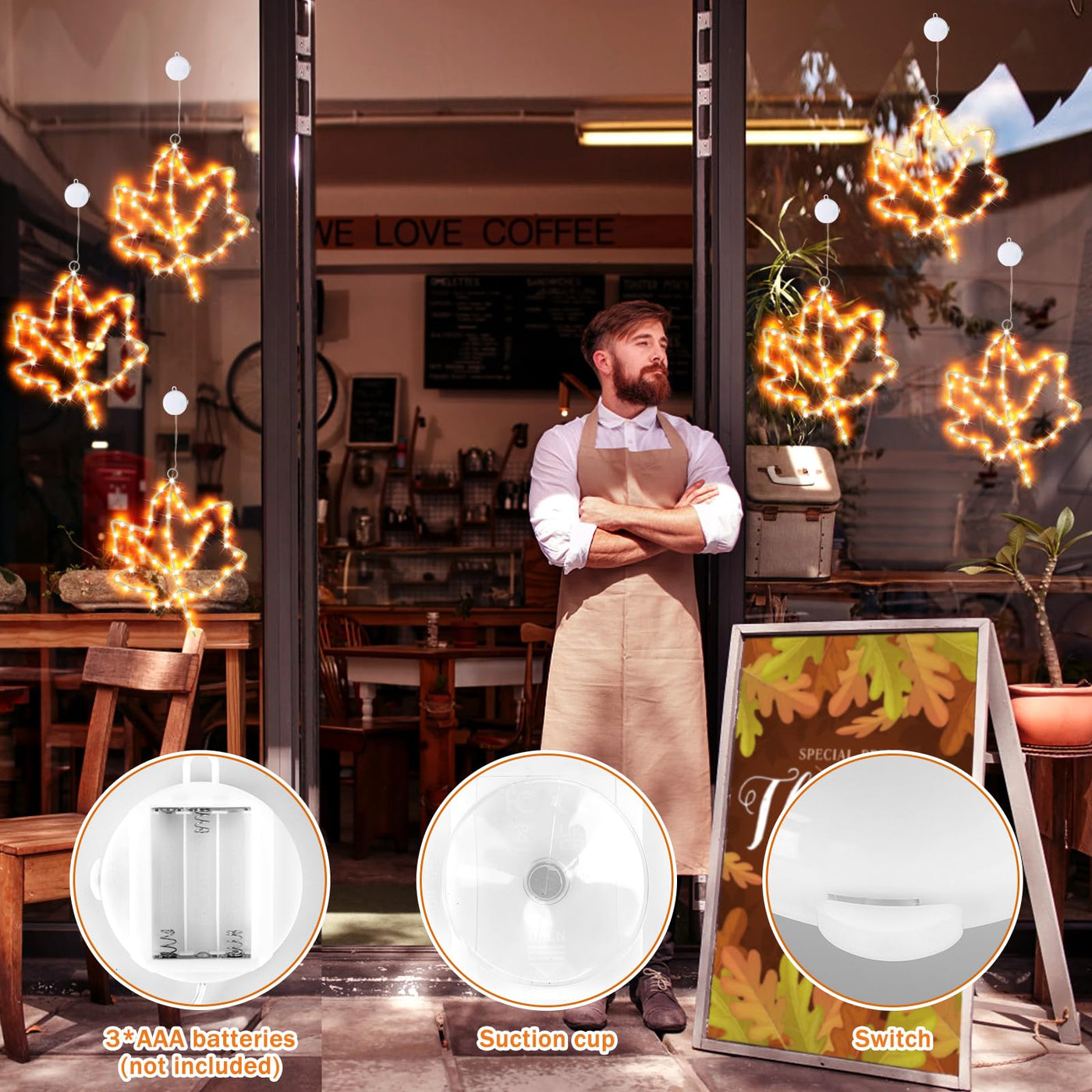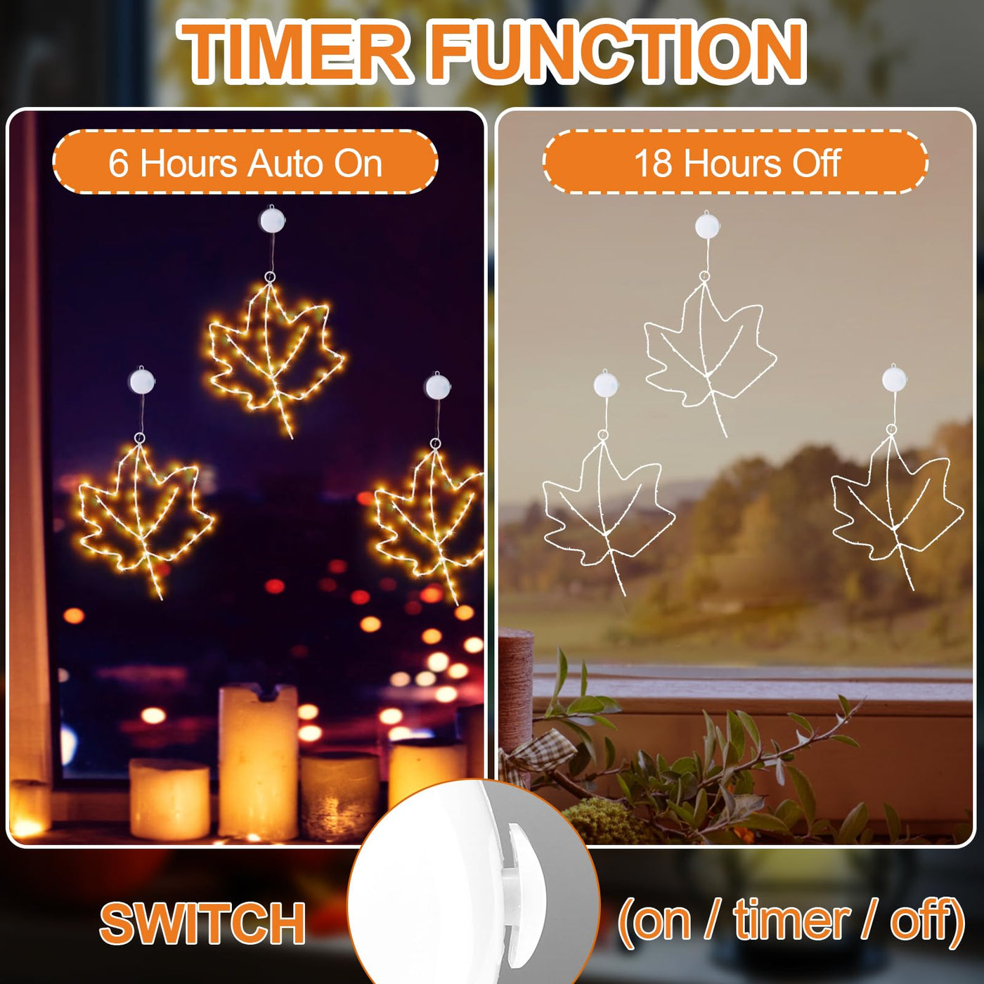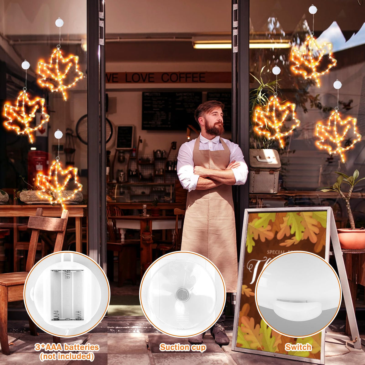 Q: How are the lights mounted on windows or surfaces?A: The fall maple leaf window lights come with suction cups on the battery box, allowing for easy mounting on any window, glass, or smooth surface. This ensures a reliable hold for your fall decorations.