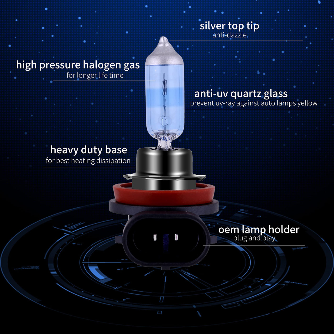 The H11 headlight bulb have 55W power and 1500LM brightness,about 5000K color temperature,You can still see the road clearly in greasy weather and rainy weather.Blue ion membrane filters yellow light and gets SUPER WHITE LIGHT.