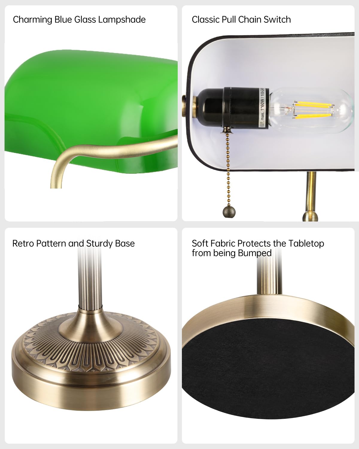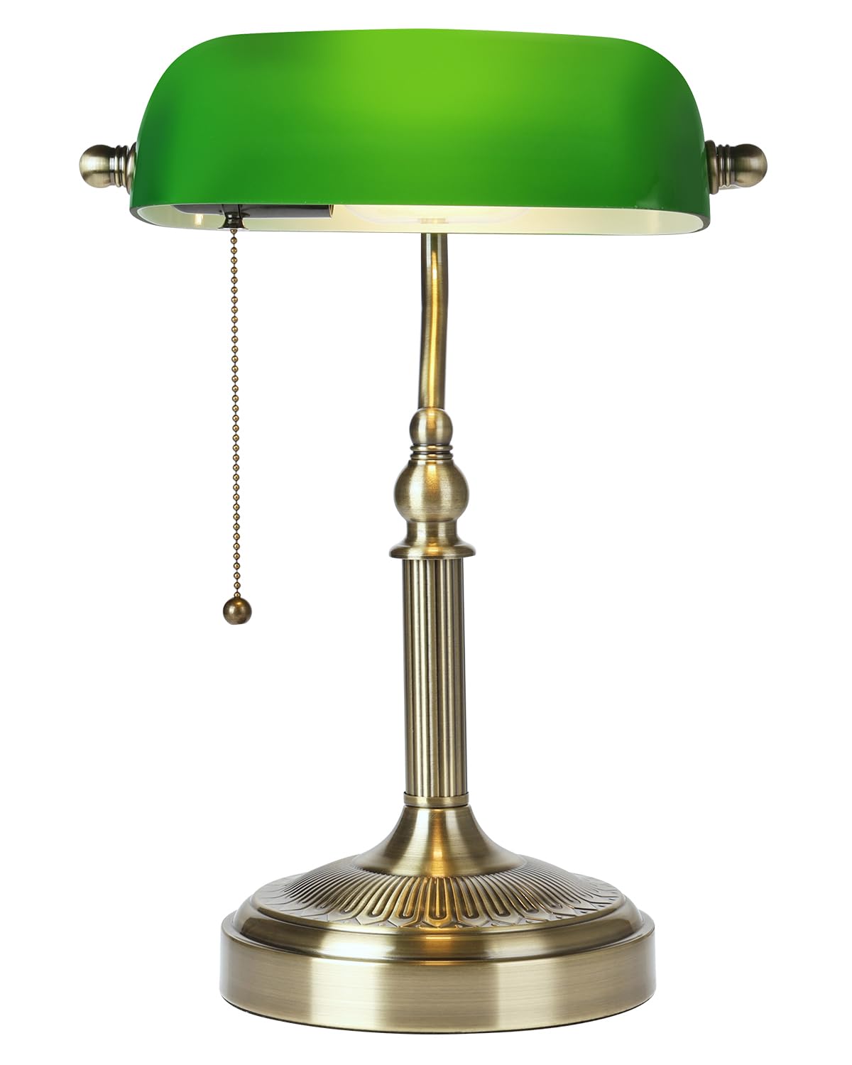 From The Manufacturer 1.Antique Green Glass Bankers Desk Lamp With Pull Chain Switch,You Can Easily Adjust The Angle To Suit Your Lighting Needs. 2.You Can Install Anywhere In Your Home.It Gave Off A Soft And Bright Flash That Lit Up Every Corner.3. Light Up Any Part Of Your Home:Suitable For Use On A Desk At Home Or At Work. Product Information 1.We Use Good Components.Electric Wire, Lamp Holder, Etc. 2.Bankers Desk Lamp Made Of Glass And Metal Add Durability To Decorating Your Space And Lighting Your Home.3.This Traditional Interior Lamp Adds A Natural Touch To Your Decor. Installation Instructions 1.Install The Lamp According To The Instruction Sheet.The Lamp Can Be Installed Quickly And Easily, And It Includes All Installed Hardware. Notes 1. Lamp Complete Assembly Needs Time And Energy. 2. When Installation, Please Switch Off The Electricity. 3. Not Include Bulb, You Can Use The Energy-Saving Light Bulbs Or Led Bulbs. Specification 1.Style:Traditional And Antique 2.Base Type :1* E26(Excluding Bulb)