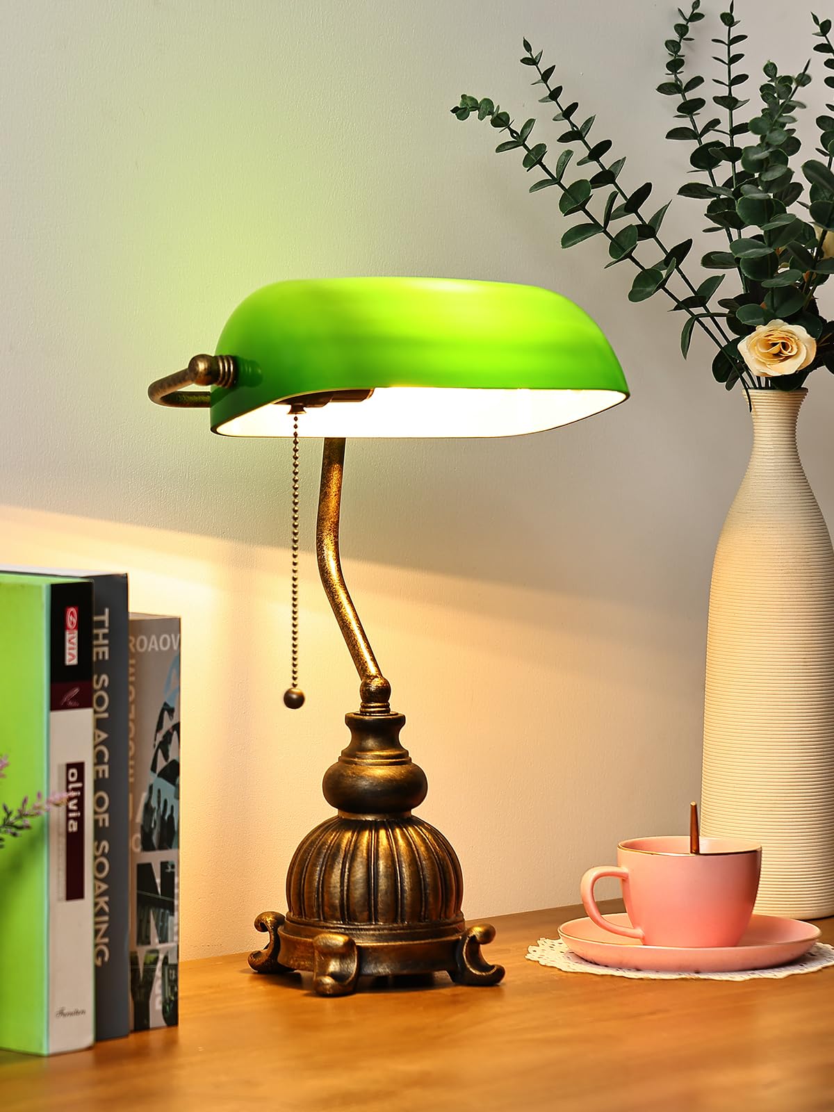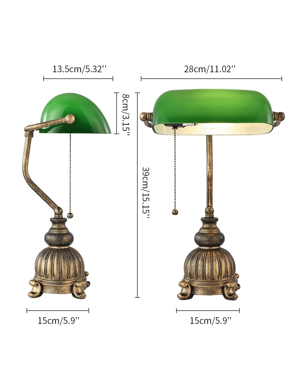 From the manufacturer 1.Antique green glass bankers desk lamp with pull chain switch,you can easily adjust the angle to suit your lighting needs. 2.You can install anywhere in your home.It gave off a soft and bright flash that lit up every corner. 3.Light up any part of your home:Suitable for use on a desk at home or at work. Product information 1.We use good components.Electric wire, lamp holder, etc. 2.Bankers desk lamp made of glass and resin add durability to decorating your space and lighting your home. 3.This traditional interior lamp adds a natural touch to your decor.Installation instructions 1.Install the lamp according to the instruction sheet.The lamp can be installed quickly and easily, and it includes all installed hardware.Notes 1. Lamp complete assembly needs time and energy. 2. When installation, please switch off the electricity. Specification 1.Style:Traditional and Antique 2.Base type :1* E26(bulb included)