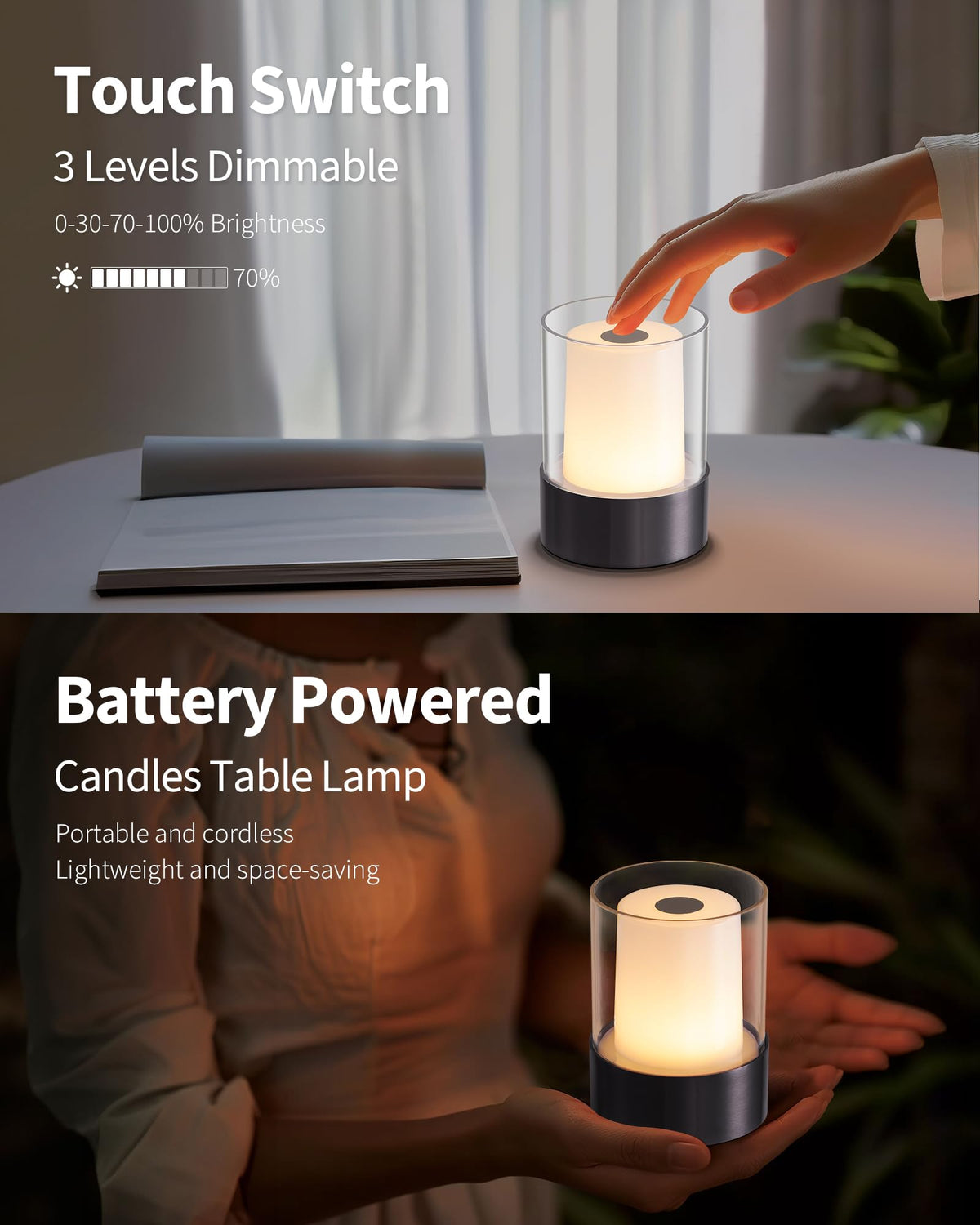 LED candlestick lamp, candle shape design, easy to create a romantic atmosphere. Easy to clean, no wire clutter, simple to assemble. The combination of transparent acrylic panel and milky white lampshade makes the light transmitted softer and more even, and the metal base enhances the overall aesthetics, harmonizing elegance and functionality. You can place it on your desktop, bookshelf, entryway or balcony wherever you want home decor. NEWSEE Cordless LED Small Touch Lamp, Modern Portable 3 Brightness Desk Light, Rechargeable Battery Powered Waterproof Outdoor Dining Table Lamp for Bedroom, Bar, Bathroom, Night Light (Black 2pcs)