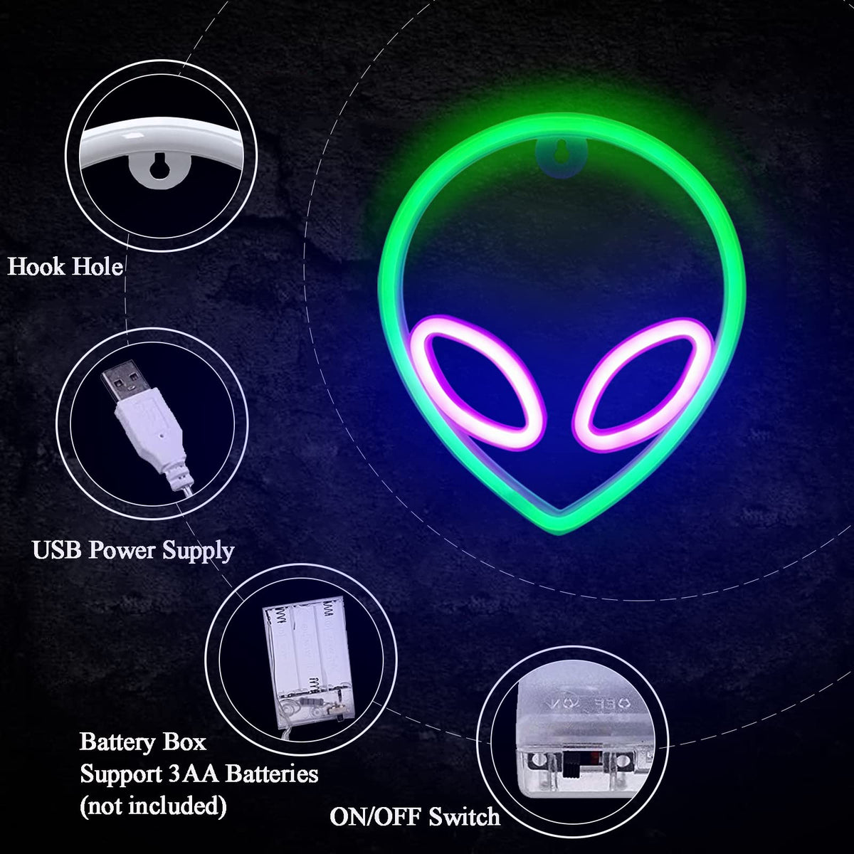 - **Versatile Power Options**: Enjoy the flexibility of two power sources! The alien neon sign can be powered by three AA batteries (not included) or through a USB connection. Simply plug it into a wall adapter or computer USB port for instant illumination. Note: Do not use both power sources simultaneously.