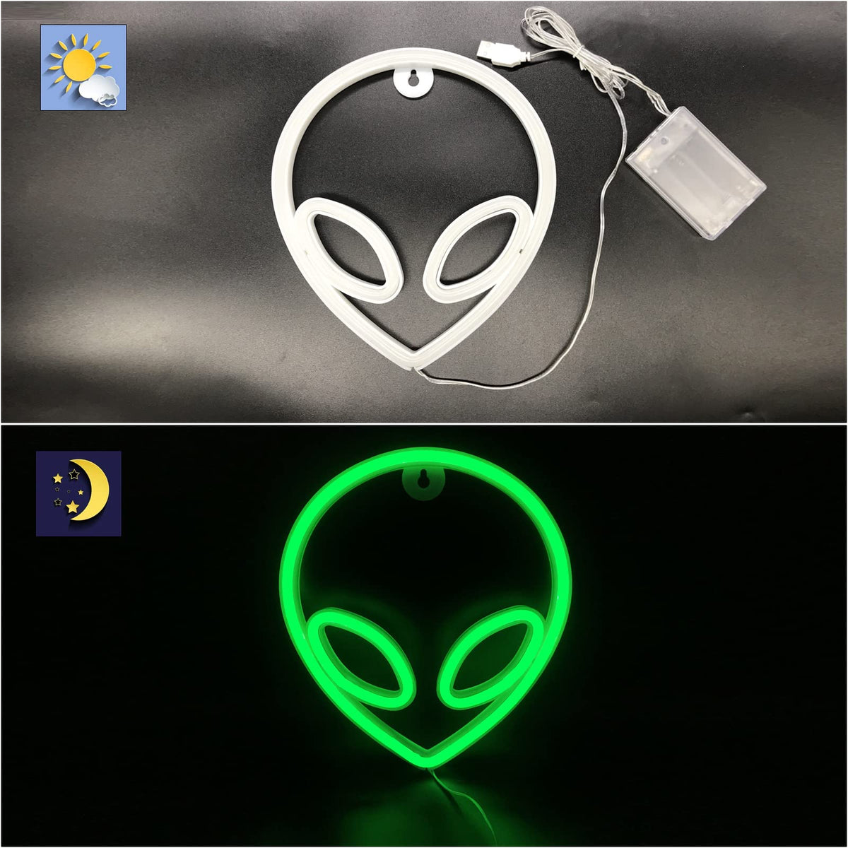 - UNIQUE COLOR & SHAPE: Crafted from durable and sturdy plastic, this vibrant green alien neon sign offers a long-lasting service life while providing a futuristic aesthetic that transforms any space. Please note that colors may vary slightly under different lighting conditions.