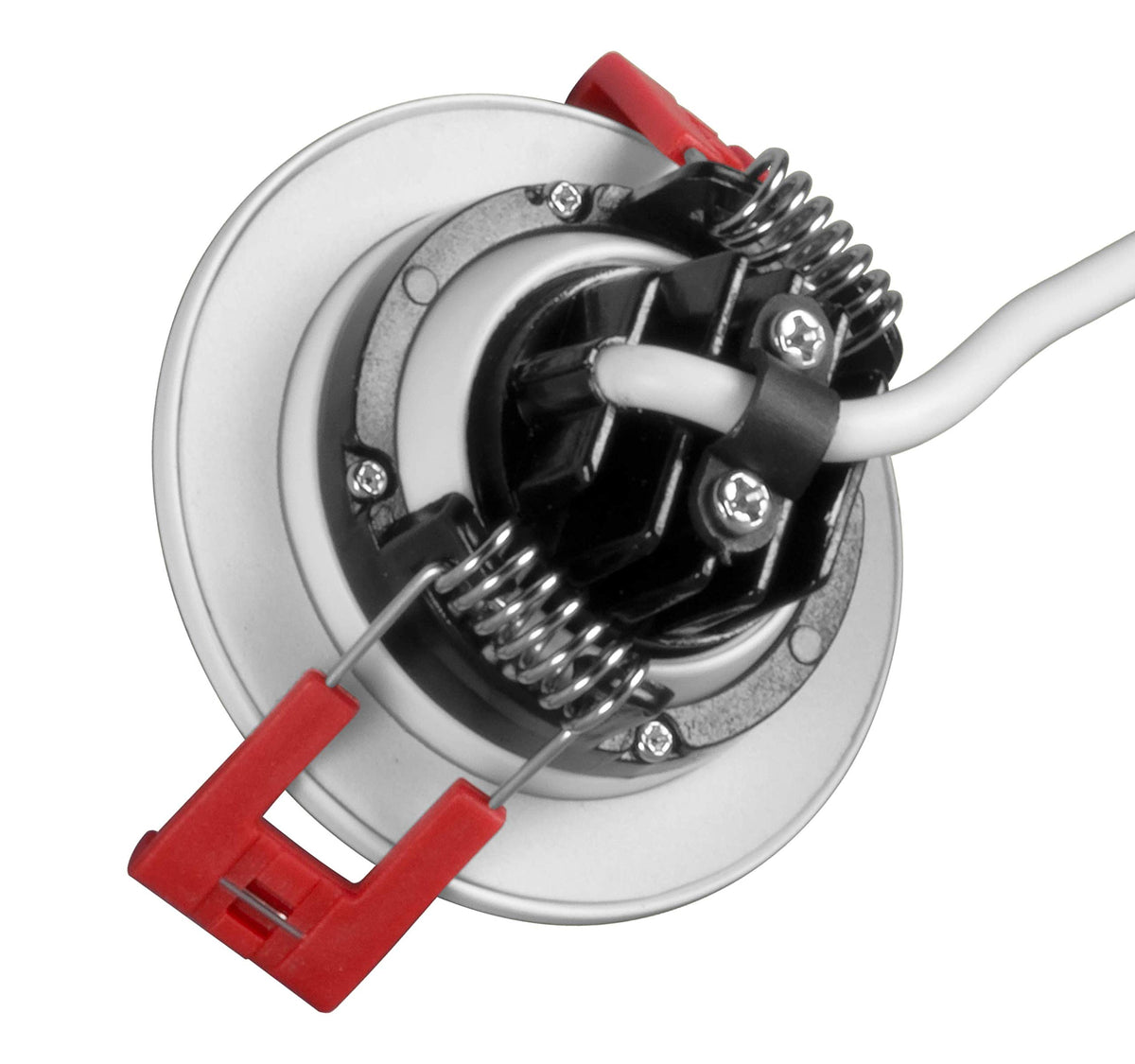Q: How is the installation process for the DGD2 LED Downlight?A: The installation is straightforward and does not require a recessed housing or junction box. You simply need to make a 2.125-inch diameter cut-out in the ceiling using the provided template, and the adjustable spring-loaded retention tabs ensure a secure fit.