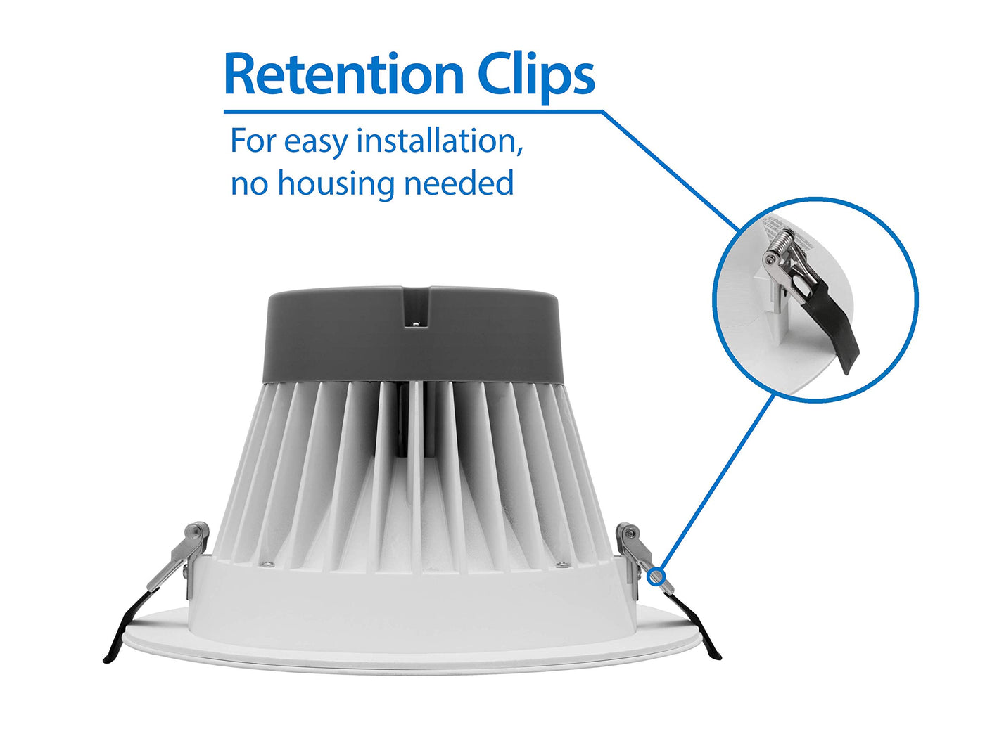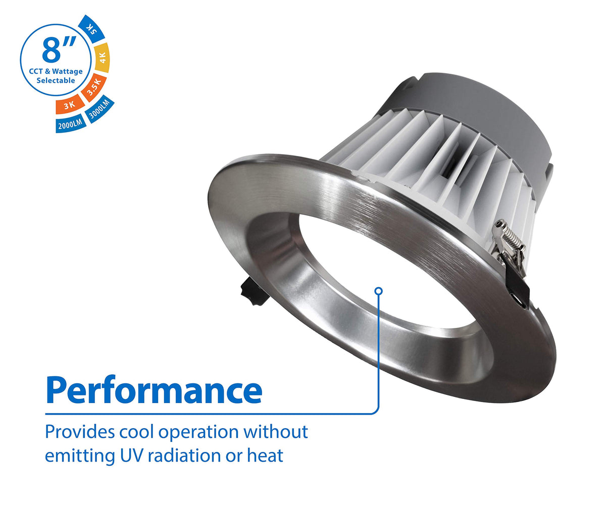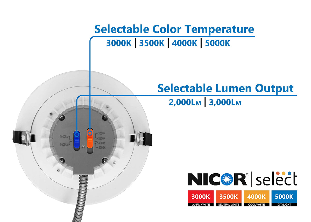 The NICOR CLR8-Select is a complete 8-inch recessed LED downlight system built to commercial grade specifications. The canless design allows for direct installation into drywall, ceiling grids, or existing mounting frames, bypassing the need for a recessed housing. Installation requires a simple circular cut-out in the ceiling using the included template. This high-output CLR8-Select features a switch on the back to select between 3000K, 3500K, 4000K, and 5000K color temperatures. Another switch lets you toggle between 2,000 and 3,000 lumens, allowing you to control the power and brightness. The CLR8-Select is also wet-location rated, energy star rated, and airtight. It features full-range dimming (0-10VDC) and a built-in multi-volt driver (120-347-Volts). In short, it’s the most versatile and complete commercial downlight system to date. It can be installed anywhere, in any setting. Use it for new construction, remodel, or retrofit applications. Available in Black, Nickel, Aged Copper, and White. The CLR8-Select is protected by NICOR’s 5-year limited warranty.