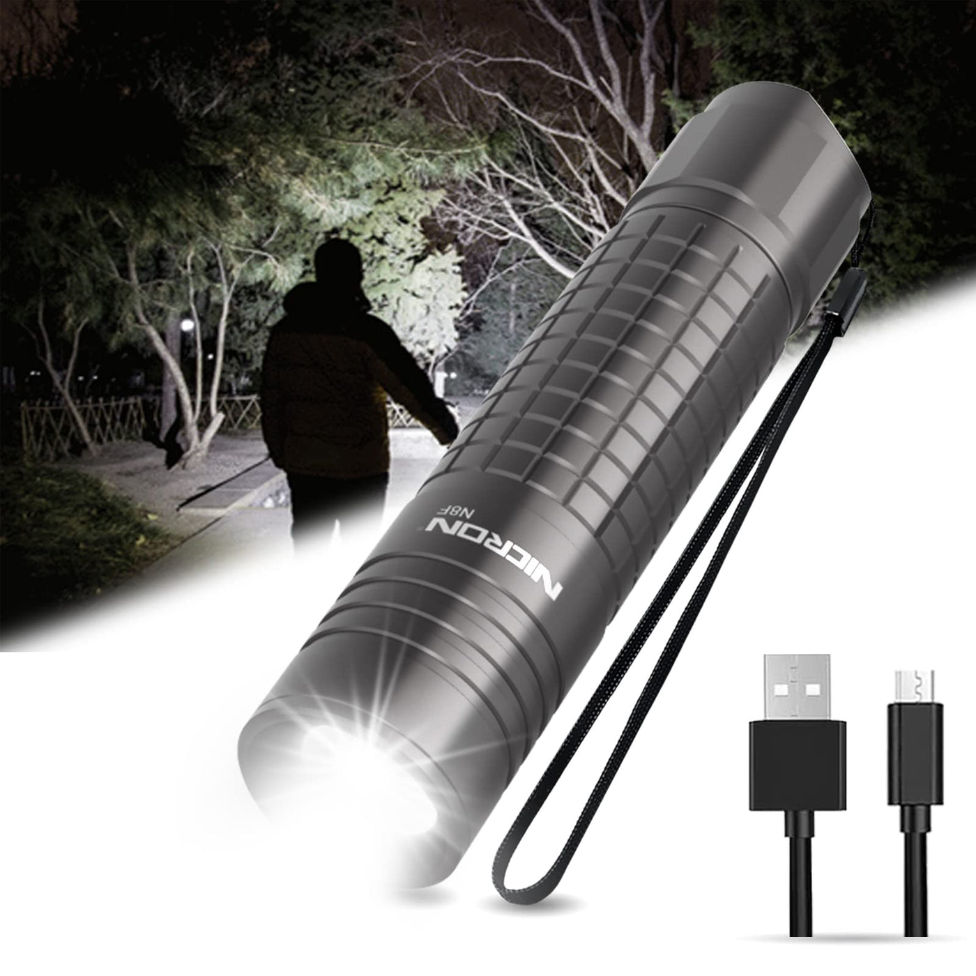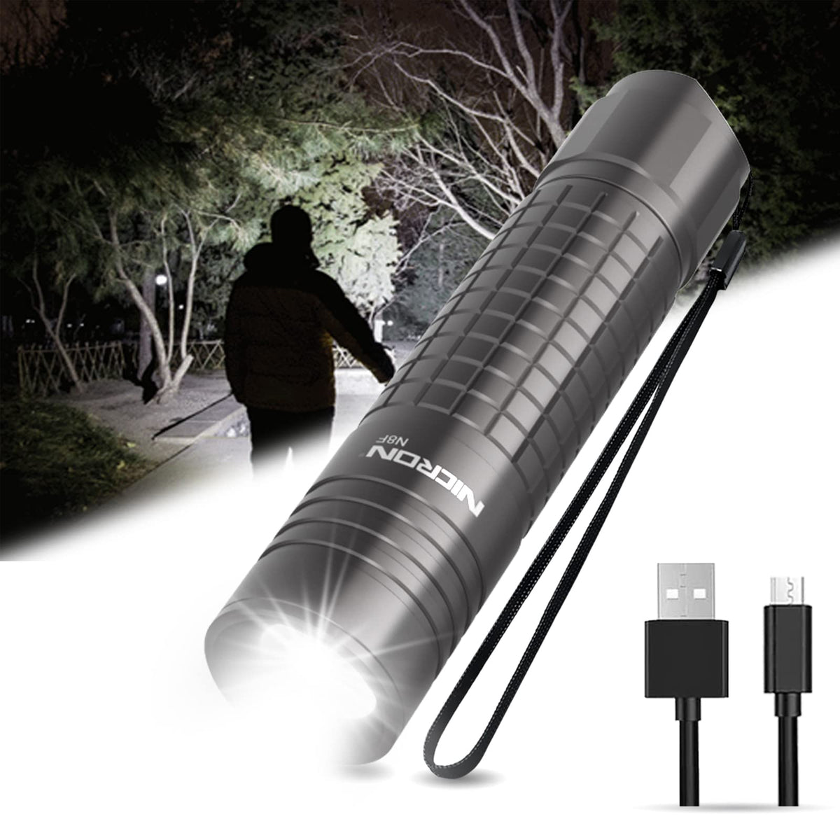 Q: Is the NICRON N8F flashlight waterproof and suitable for outdoor use?A: Yes, the NICRON N8F flashlight has an IP65 rating, making it waterproof and dustproof. It can withstand exposure to rain and can be submerged for short periods, making it ideal for outdoor activities such as camping, fishing, and jogging.