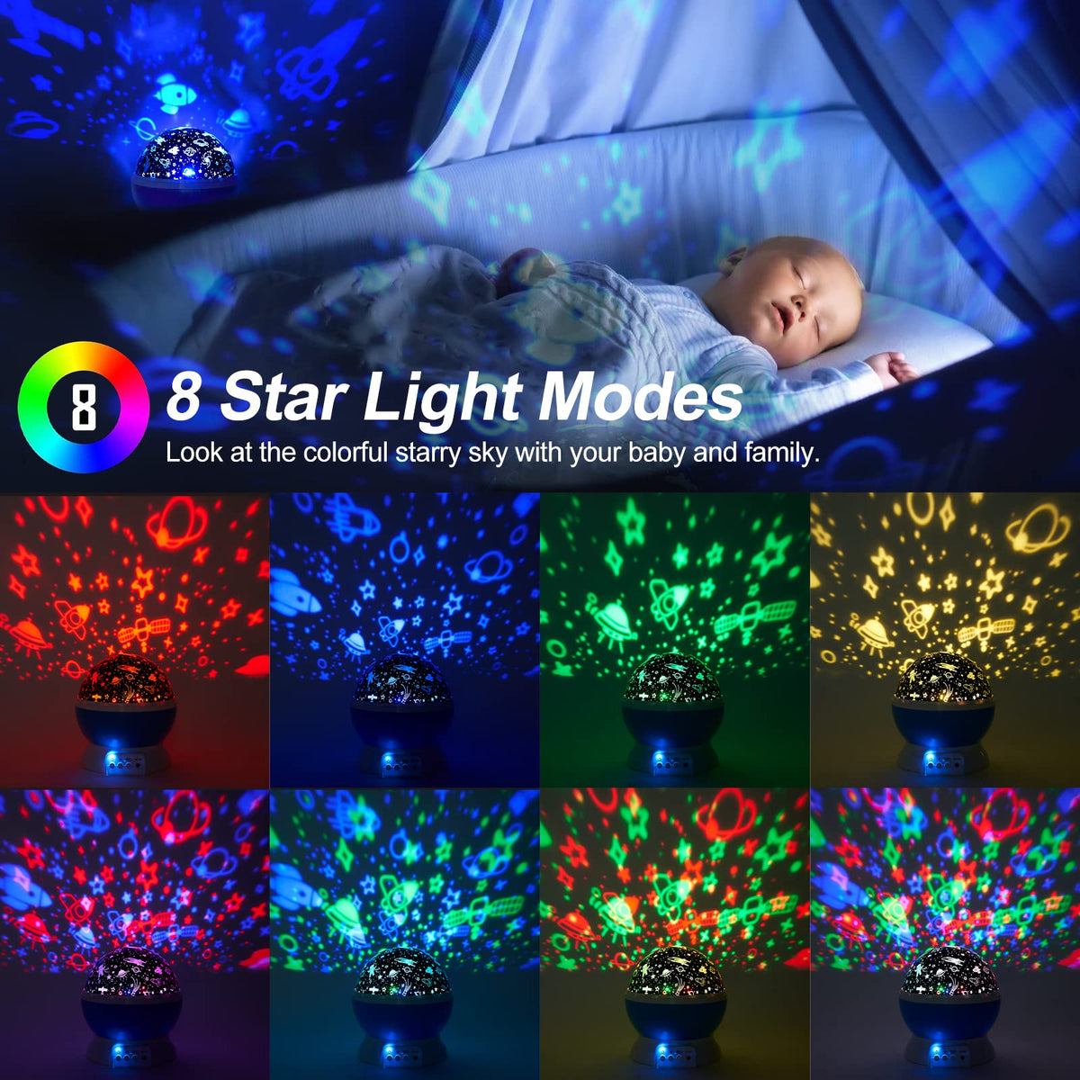 Night Light Projector with Remote Control, Baby Star Projector 360 Rotation Starry Sky Lights Space and Ocean Themes with 8 Ligh