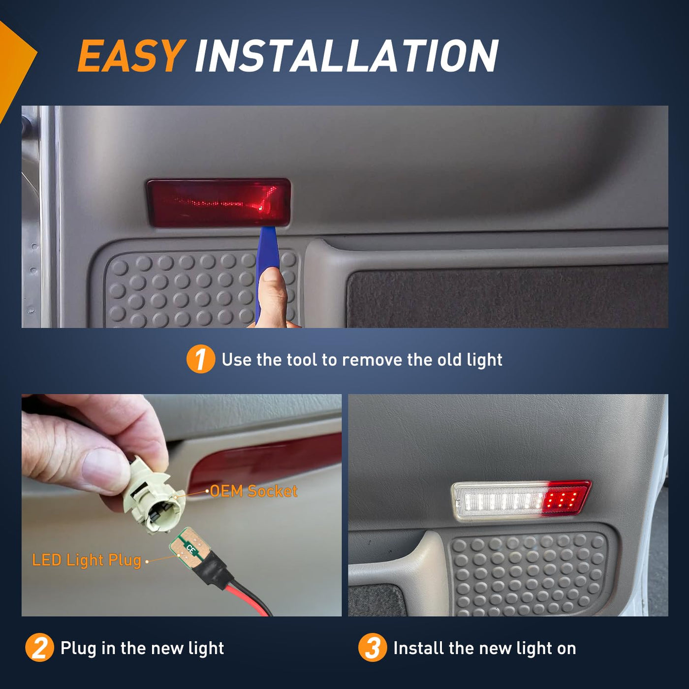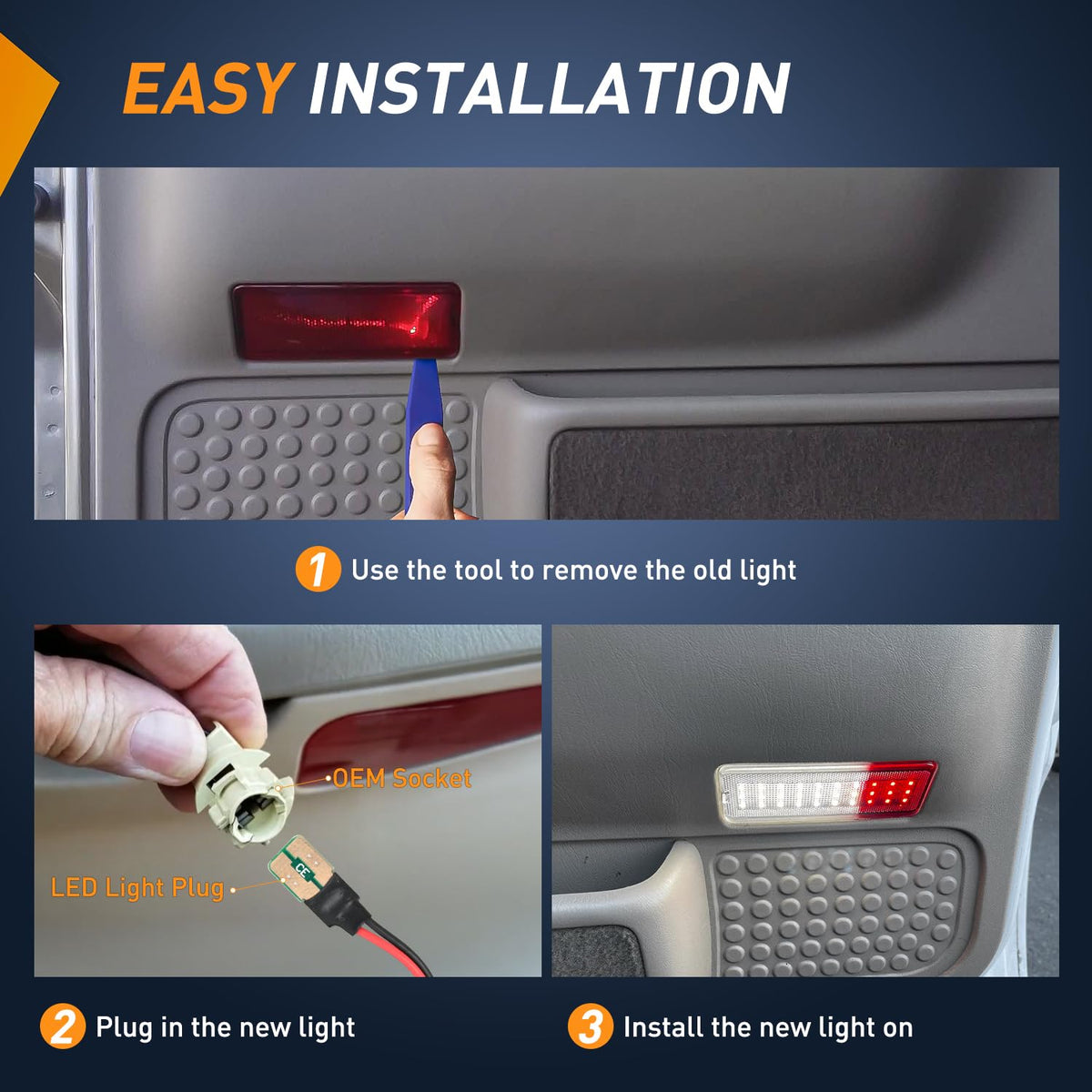 Build to Last & Super Bright: Crafted from high-quality ABS plastic housing and lens, these lights are resistant to fading even after prolonged exposure. Experience 6 times more brightness than traditional incandescent bulbs, thanks to built-in high-power SMD LED chips that maximize illumination on your vehicle's interior side doors.