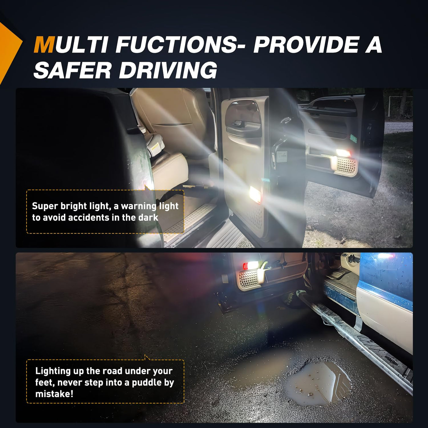 Safer Driving: Enhance your safety with these LED door panel lights that serve multiple functions, including courtesy lighting, puddle lighting, and as a warning light at night, significantly reducing the risk of accidents.