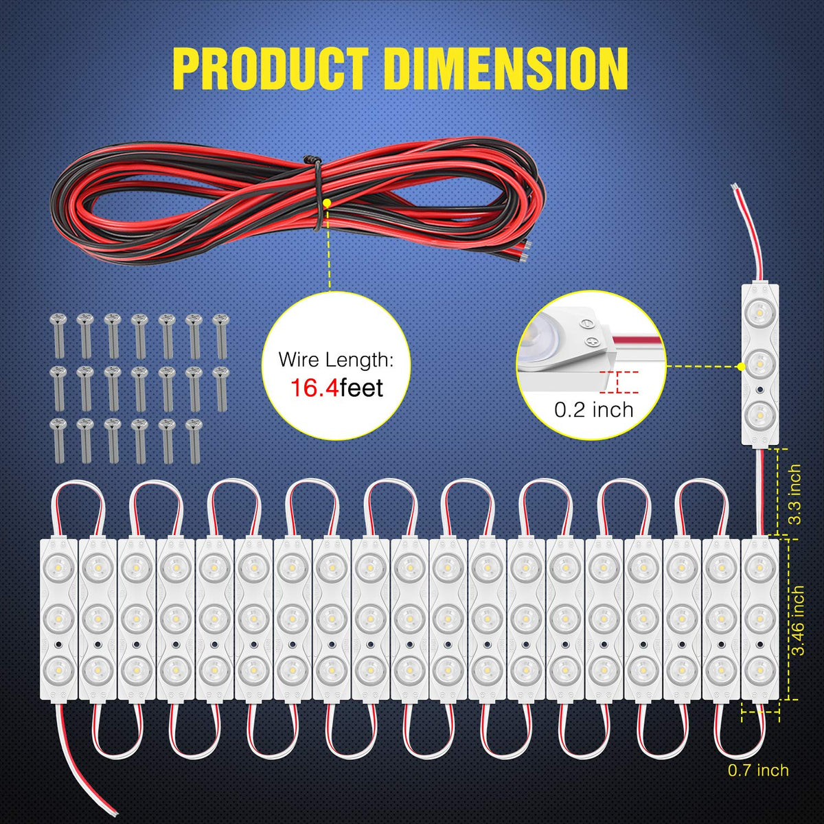 Specification: Input Voltage:DC12V LED Number(Single module):3PCS Waterproof rate: IP67 Extension Wire Length: 16.4Feet Packing List: 1 x LED Interior Lights Kit 1 x 16.4Ft Extra Wire 20 x Screws Note: The installation surface should be smooth, clean and dry.