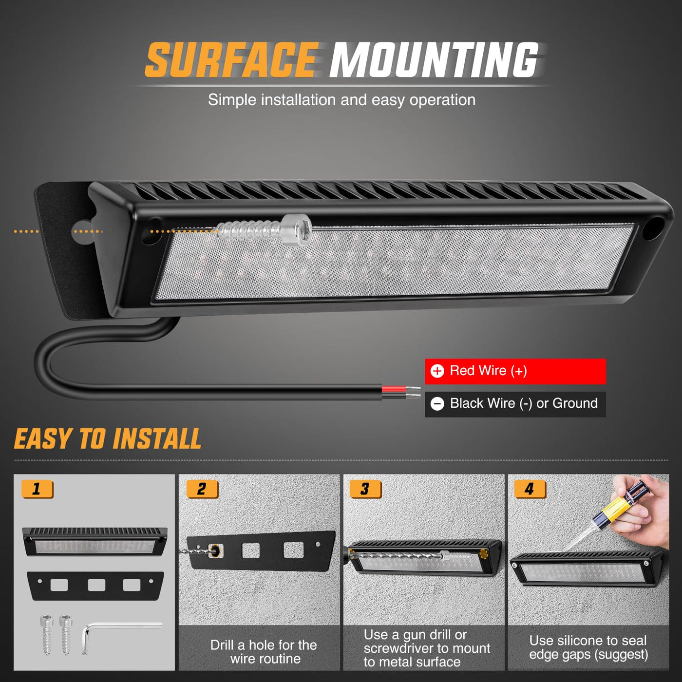 Constructed from durable aluminum, this floodlight features a combination of 60 SMD LED chips that emit a bright amber light with a color temperature ranging from 1700 to 1900K. The anti-glare PC lens ensures a soft, widely spread light, providing visibility without discomfort. With an IP67 waterproof rating, this floodlight is built to withstand harsh weather conditions, making it ideal for long-term outdoor use. The die-cast aluminum alloy shell offers resistance to dust, rust, and shock, ensuring reliable performance over time. Installation is straightforward: simply pre-drill a hole for the wiring harness, secure the lights with self-tapping screws, and connect the harness to a power source using a recommended 16AWG wiring harness.